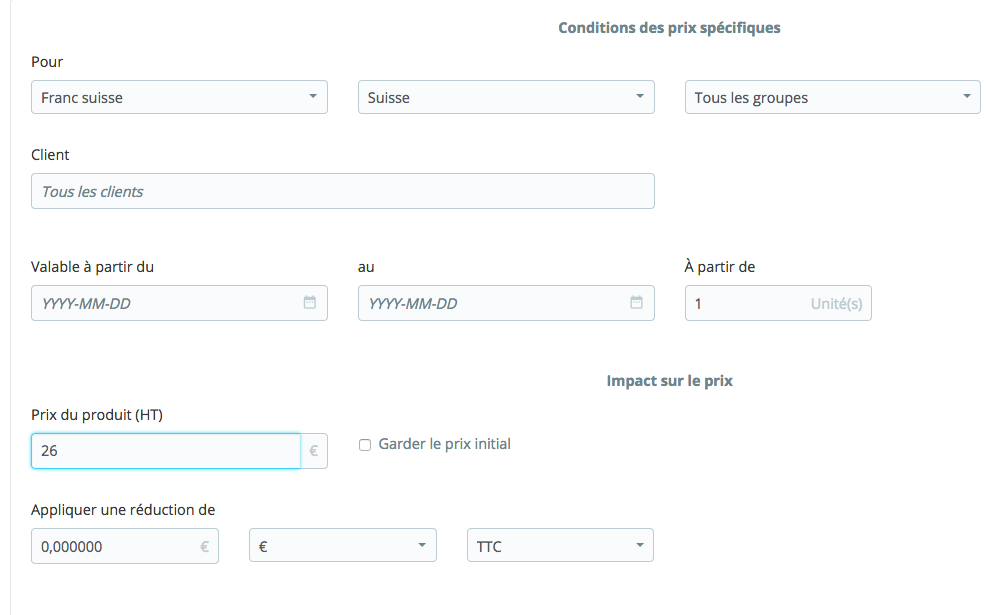 granpopo Posted August 24, 2017 Share Posted August 24, 2017 Bonjour à tous, J'espère que vous pourrez m'aider, car j'ai l'impression d'un bug sur ma boutique : Version PS : 1.7.2.0 Voici ce que je souhaite faire : 1/ - Avoir un produit (appelons le P1) dont le prix s'affiche en €, sauf pour ceux qui habitent au canada (affiche en dollars canadien) et ceux qui habitent en Suisse (affiche en franc suisse) ? 2/ - Sur ce même produit P1, les prix ne sont pas fixés en fonction du taux de change, mais des prix définis selon les pays. Par exemple il coûte 20€ en europe, 50 dollars canadien au Canada, et 35 franc suisse en Suisse...Comment faire pour que les Canadiens voient le prix en dollars canadien et que le suisse voit en Franc suisse (avec leur prix respectif définis)? La manipulation que j'ai fait : J'ai crée un prix spécifique pour mon produit En € le produit coûte 17€...en CHF 26 (je ne tiens pas compte du taux de change pour fixer le prix en € et en CHF)...le taux de change est de 1,1454 du coup j'ai appliqué la formule : 26/1,1454 = 22,6994936267 CHF à noter dans la case correspondante "prix du produit HT"...hors dans le récap que me fait prestashop il note le prix : 22,6994936267 CHF et non 26CHF. Du coup dans un second temps j'ai donc noté directement le prix suisse en CHF soit 26...et dans son récap il me note bien 26 CHF (CF les PJ) Mais je ne sais pas si ça fonctionnera...Est ce que le Suisse verra 26 CHF de chez lui ? et surtout paiera 26 CHF... Ou est ce un bug ? Merci de votre aide ! Link to comment Share on other sites More sharing options...