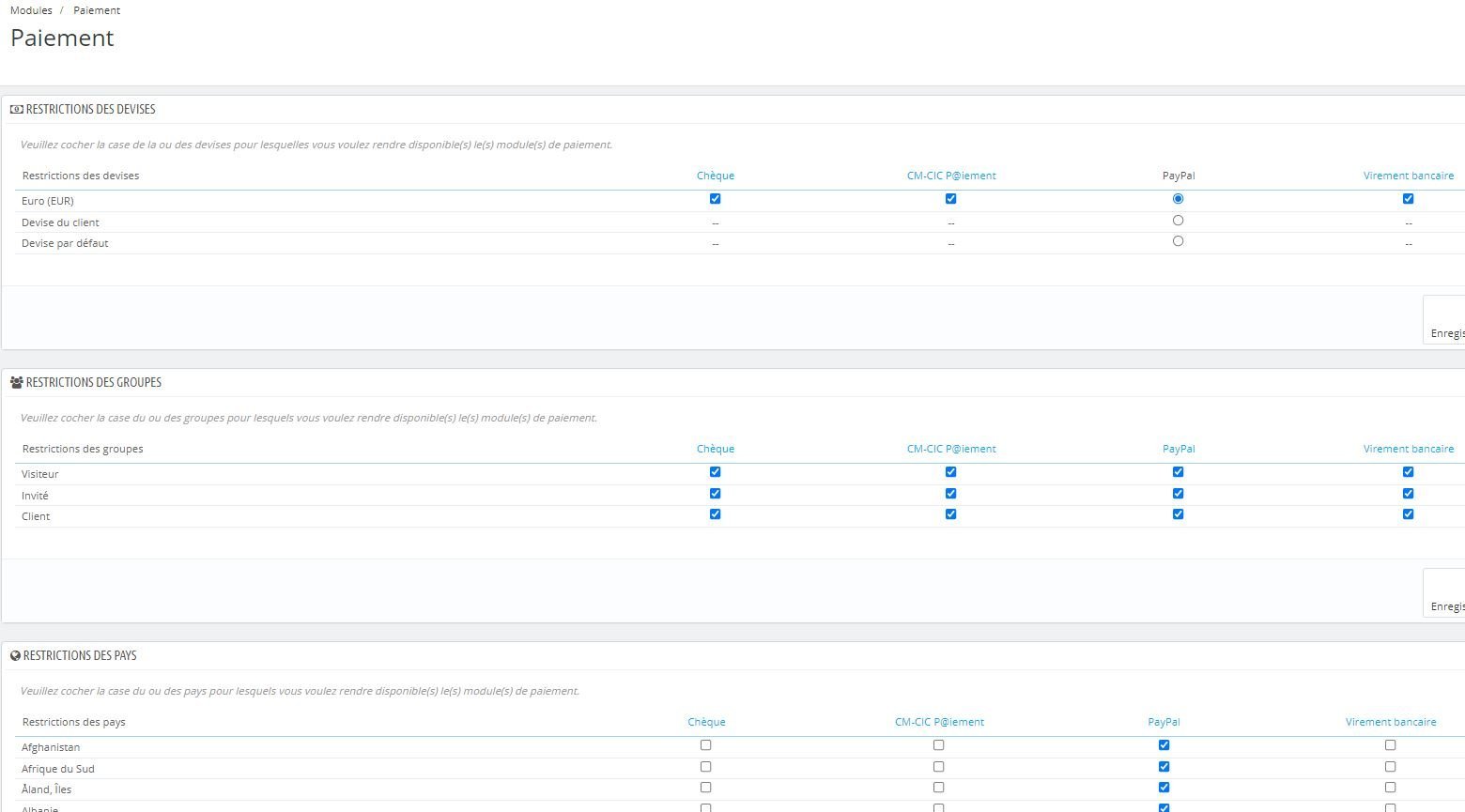 Babylon64100 Posted July 23, 2021 Share Posted July 23, 2021 Bonjour, J'ai le même problème, Paypal ne s'affiche pas comme moyen de paiement. Presta 1.6.1.24 - Paypal version v3.16.2. J'ai donc vérifié les restrictions tout est correct (photo ci dessous). J'ai vidé le cache, les cookies de mon navigateur etc toujours rien... Le module est bien activé et affiché dans hook displayPayment Je sais plus quoi faire, quelqu'un peu m'aider svp ? Link to comment Share on other sites More sharing options...