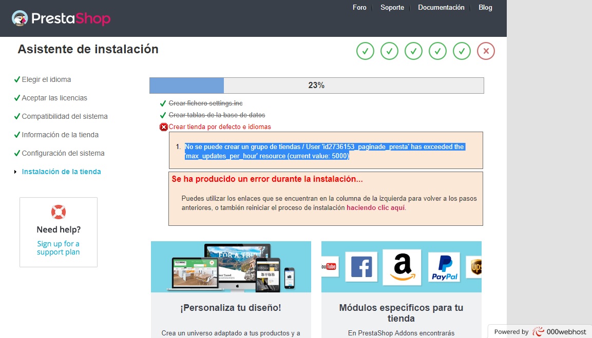 rd2017mx Posted August 31, 2017 Share Posted August 31, 2017 Buenas noches Estoy intentando instalar, en el último paso se me queda en un 23% y me da el siguiente error: No se puede crear un grupo de tiendas / User 'id2736153_paginade_presta' has exceeded the 'max_updates_per_hour' resource (current value: 5000) y no puedo continuar me pueden ayudar? Gracias Adjunto captura de pantalla Link to comment Share on other sites More sharing options...