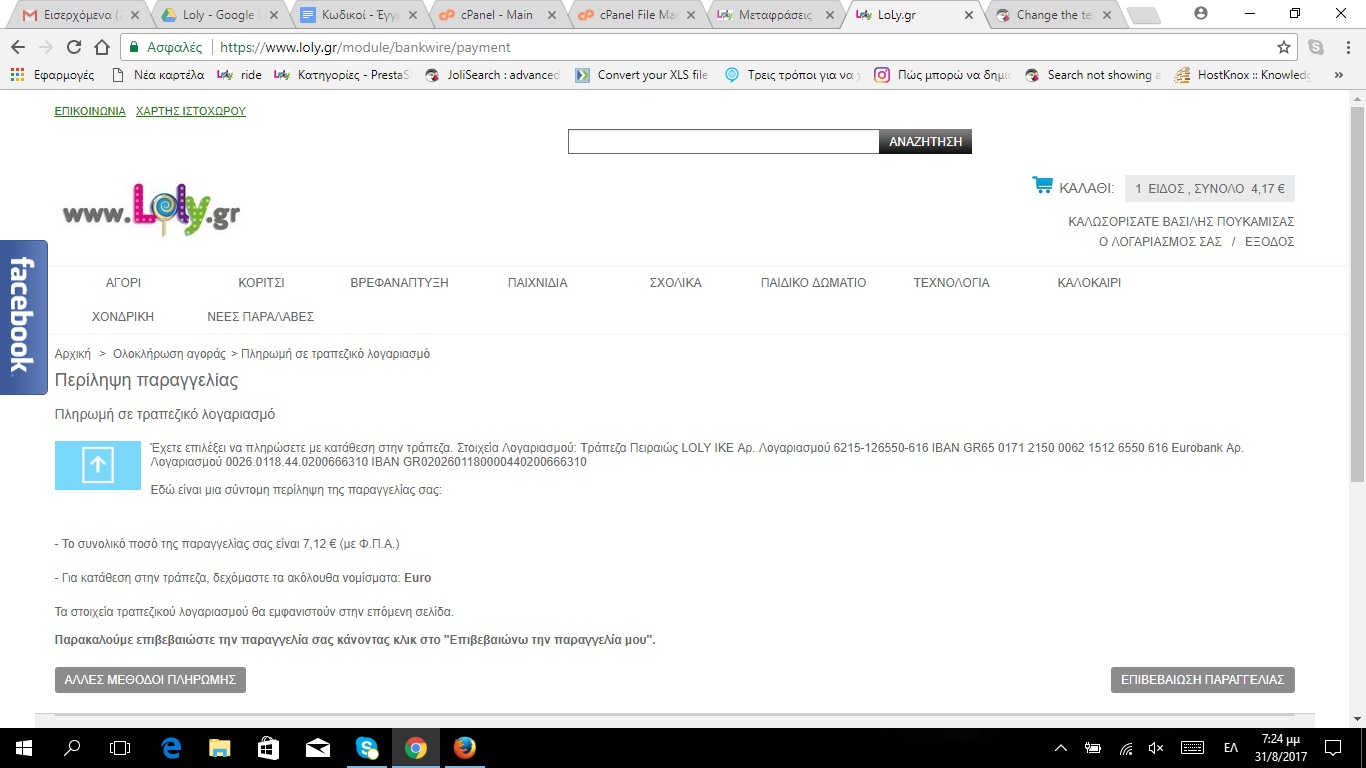 01generator Posted August 31, 2017 Share Posted August 31, 2017 Καλησπέρα, η εταιρία μου έχει αλλάξει επωνυμία και θα ήθελα να αλλάξω το κείμενο που εμφανίζεται όταν ο πελάτης ζητάει να κάνει πληρωμή μεσω τράπεζας. (Δηλαδή το LOLY IKE να γίνει LOLY EE και τους λογαρισμούς τραπέζης) έχω πάει στο φάκελο translation του bankwire module στο αρχείο el.php μέσα στο οποίο είναι οι μεταφράσεις του συγκεκριμένου module (καθώς μέσα απο το τοπικές ρυθμίσεις-> Μεταφράσεις κ.τ.λ μου ζητούσε αύξηση της "max_imput_vars" για να μπορέσει να κάνει τις μεταφράσεις στο "Μεταφράσεις εγκατεστημένων Module") , άλλα δεν βρήκα το κείμενο που θέλω να αλλάξω. Επίσης να αναφέρω ότι πήγα και έκανα και τις απαραίτητες αλλαγές στο απο το μενού "Πρόσθετα" μέσα απο το οποίο βρήκα το πρόσθετο "Kατάθεση στην τράπεζα" και έκανα και εκεί τις ανάλογες αλλαγές, καθάρισα και τα cookies άλλα τίποτα.Γνωρίζει κανείς πως μπορώ να αλλάζω αυτό το κείμενο; Έχω επισηνάψει και εικόνα για να δείξω σε ποια φάση της παραγγελία θέλω να αλλάξω το κείμενο που φαίνεται. Ευχαριστώ εκ των προτέρων Διαμόρφωση πρόσθετου bankwire για να αλλάξεις τις πληροφορίες τραπεζης ονόματος κλπ Link to comment Share on other sites More sharing options...