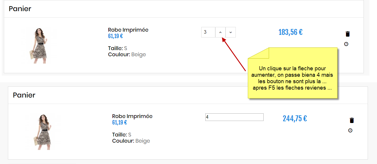 Ronald72 Posted September 2, 2017 Share Posted September 2, 2017 Bonjour, Depuis qq temps j'ai des souci d'affichage dans panier lorsque on clique sur la flèche augmenter ou diminuer la quantité des articles dans le panier, le modification ne peut ce faire qu'une seule fois puisque après les flèches dis-paresse, il faut faire F5 pour que les flèches redeviennes actif ??? j'ai essayer de désactivé tout les modules dans le Debug, mais ça ne change rien ou impression d'ecran dropbox : https://www.dropbox.com/s/umyn1s5oshimzh5/bug_augmentation_panier_v170.png?dl=0 Version de PrestaShop : 1.7.2.0 (idem en 1.7.2.2) Informations sur votre serveurInformations du serveur : Linux #1 SMP PREEMPT Tue Mar 29 19:14:05 UTC 2016 x86_64 Version du logiciel serveur : Apache/2.4.25 Version de PHP : 5.6.30-5+0~20170223133305.27+jessie~1.gbp1ee0cb Limite de mémoire : 128M Temps maximal d'exécution : 180 Taille max. pour envoi de fichiers : 128M Merci d'avance de votre aide Link to comment Share on other sites More sharing options...
