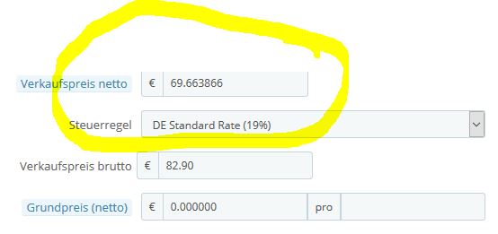 Claudiocool Posted September 3, 2017 Share Posted September 3, 2017 Hallo Freunde, die Suche gab hier nichts her, darum mal kurz hier die Frage: Wenn ich einem Artikel Varianten zuweise, die sich dann auch preislich auswirken, kann ich ja den Netto- oder den Bruttopreis angeben, so wie bei den Preisen grundsätzlich ja auch. Der Unterschied bei beiden ist, dass der Artikelpreis selbst die Nettopreisform 6-stellig hinter dem Komma ist, so dass letztendlich kaum Rundungsfehler auftreten bei Kunden, die Bruttopreise bezahlen, bei den Varianten ist es aber beim Nettopreis so, dass nur 2 Stellen hinter dem Komma auftauchen, was dann schnell zu Rundungsfehlern führt, wenn man gleich mehrere Produkte im Wagen liegen hat und bei der Anlage des Preises den Nettopüreis gesetzt hatte. Jetzt bin ich auf der Suche, wo das Preisformat geändert werden muss. Hier das beim Normalpreis: Und jetzt bei den Varainten: Gibt man es Brutto ein, wird es in der Datenbank mit den 6 Stellen gespeichert, das ist also mathematisch korrekt, aber ich kriege nach dem Speichern im BO nur den gerundeten Nettopreis gezeigt, weiß dann also nicht, ob der glatt ist oder eben ab der 3. Stelle noch was kommt. Lustig ist, dass man es bei der Anlage eines Bruttopreises sieht, wie er das netto berechnet, aber wenn man später drübergeht, eben nur 2 Stellen sieht. Link to comment Share on other sites More sharing options...