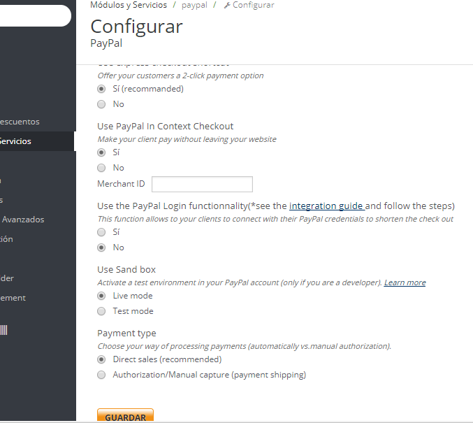 Heartcraftmx Posted September 15, 2017 Author Share Posted September 15, 2017 Buenos días, ya veo la diferencia, el módulo que tienes tu es el de Paypal México, tiene bastantes menos opciones que el de Paypal Europa que es el que suelo manejar, así que poco más te puedo decir. Desconozco si la opción que te he dicho de "Use the PayPal Login functionnality" o algunas de las otras opciones se pueden manejar desde la propia administración de Paypal. Saludos y suerte! Gracias por responder!. Si instalo la de paypal Europa encontrare entonces estas opciones? Link to comment Share on other sites More sharing options...