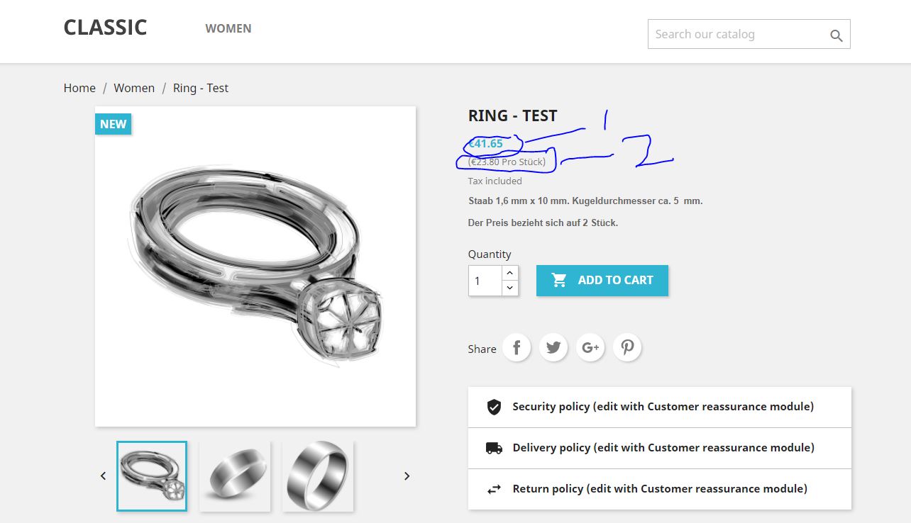 web-uiz Posted September 6, 2017 Share Posted September 6, 2017 (edited) Hello, I am using prestashop for my shop, how do i replace the product price with the product unit price at the home page , category page and the product pagein my shop. Please guide me with the same. I am attaching 2 images. The first one is the image from my homepage where i want to see the product price. The second one is the product page, where i have placed seperate prices (price [1] and unit price[2])Please Help, Its UrgentThanks in advance. Edited September 11, 2017 by web-uiz (see edit history) Link to comment Share on other sites More sharing options...