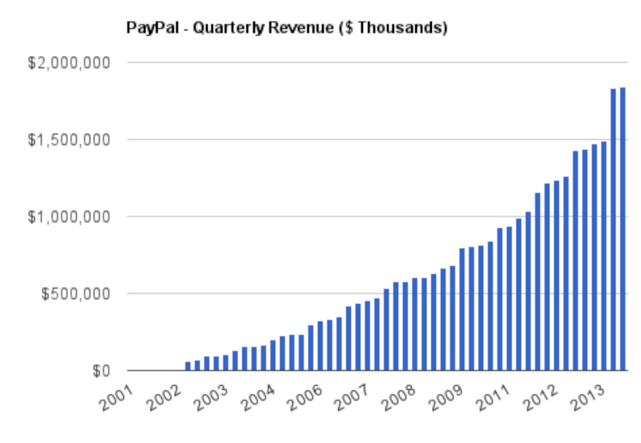 SliderFlash Posted September 7, 2017 Author Share Posted September 7, 2017 Statistik 2001 bis 2013 - auch danach gehen die Umsätze bzw. Erträge immer noch steil nach oben. Ich bin nicht der grosse PayPal-Anhänger, aber Fakten kann man schlecht anders interpretieren. PayPal_Revenues.jpg Erträge, Quartalszahlen in Tausend Diese Grafik sagt gar nichts aus und Schön für PayPal das du auch noch hier Werbung für die machst Link to comment Share on other sites More sharing options...