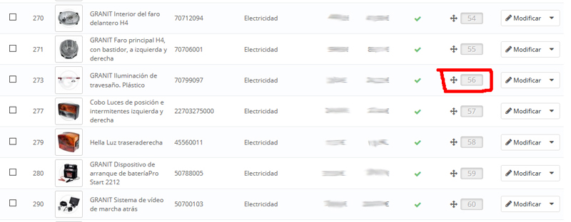 3punto3 Posted September 7, 2017 Share Posted September 7, 2017 Hola, Tengo una tienda en prestashop 1.6.1.6, y necesito ordenar manualmente y según me de la gana los productos destacados. Tengo unos 100 destacados (necesidades del negocio) Hasta ahora, el producto que quiero que esté en destacados lo asigno a la categoría inicio. para ordenarlos, filtro por categoría, escojo inicio y ordeno según necesito arrastrando de las flechitas. hasta aquí todo perfecto. La cuestión es que me toca hacerlo con mucha frecuencia y con varios productos, y pasar arrastrando un producto de la posición 56 a la 3 es un suplicio cuando lo tienes que hacer varias veces. Pregunta: ¿Hay forma, gratuita o de pago, configuración, modificación de código, o lo que sea, para poder especificar la posición de un artículo escribiendo el número de la posición que quiero que ocupe? Por ejemplo, si se pudiera poner el 3 en la cajita que tiene el 56, sería ideal. Os dejo una captura d elo que digo Muchas gracias Link to comment Share on other sites More sharing options...