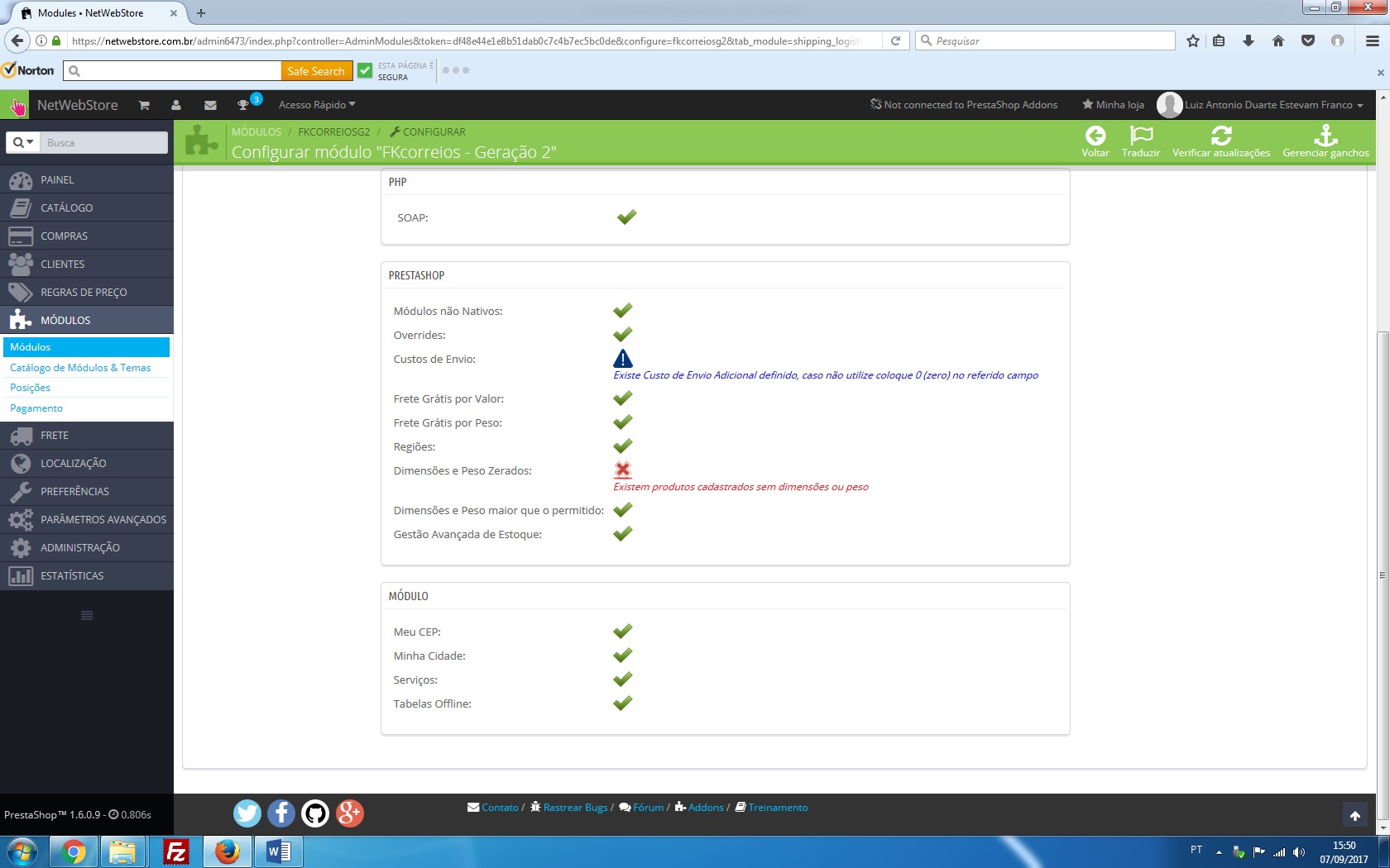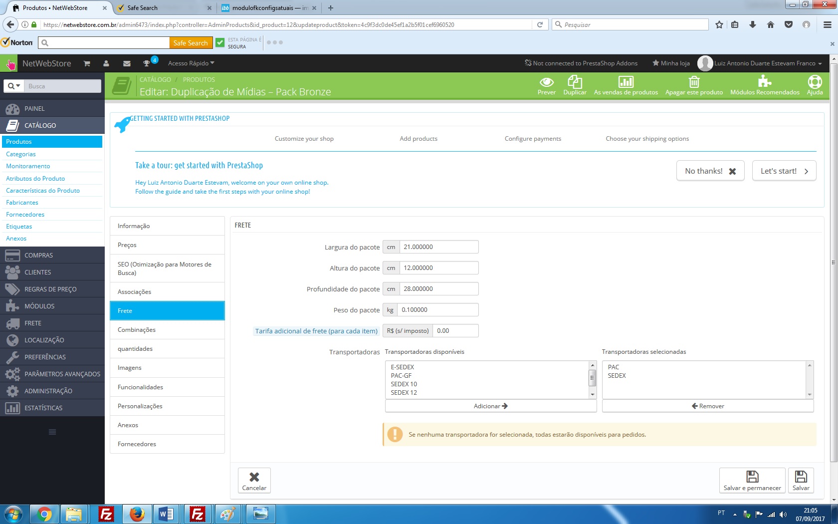 Daniel - PrestaBR Posted September 11, 2017 Share Posted September 11, 2017 DÚVIDA : aonde seria este campo, está dentro das configurações do modulo de correios, frete, transportadora ou está no produto que é o unico da loja que necessita de frete por correios por enquanto No menu Envio > Preferências tem o campo para definir o custo extra de envio. Duvida 2: Aonde vejo isto na loja já que o unico produto cadastrado está com os pesos definidos como mostra a segunda imagem em anexo Verifique todos os produtos da loja, inclusive os produtos de exemplo que vêm na instalação. Isto normalmente não impede o funcionamento do módulo, mas se um produto não tiver peso, pode dar erro. Link to comment Share on other sites More sharing options...