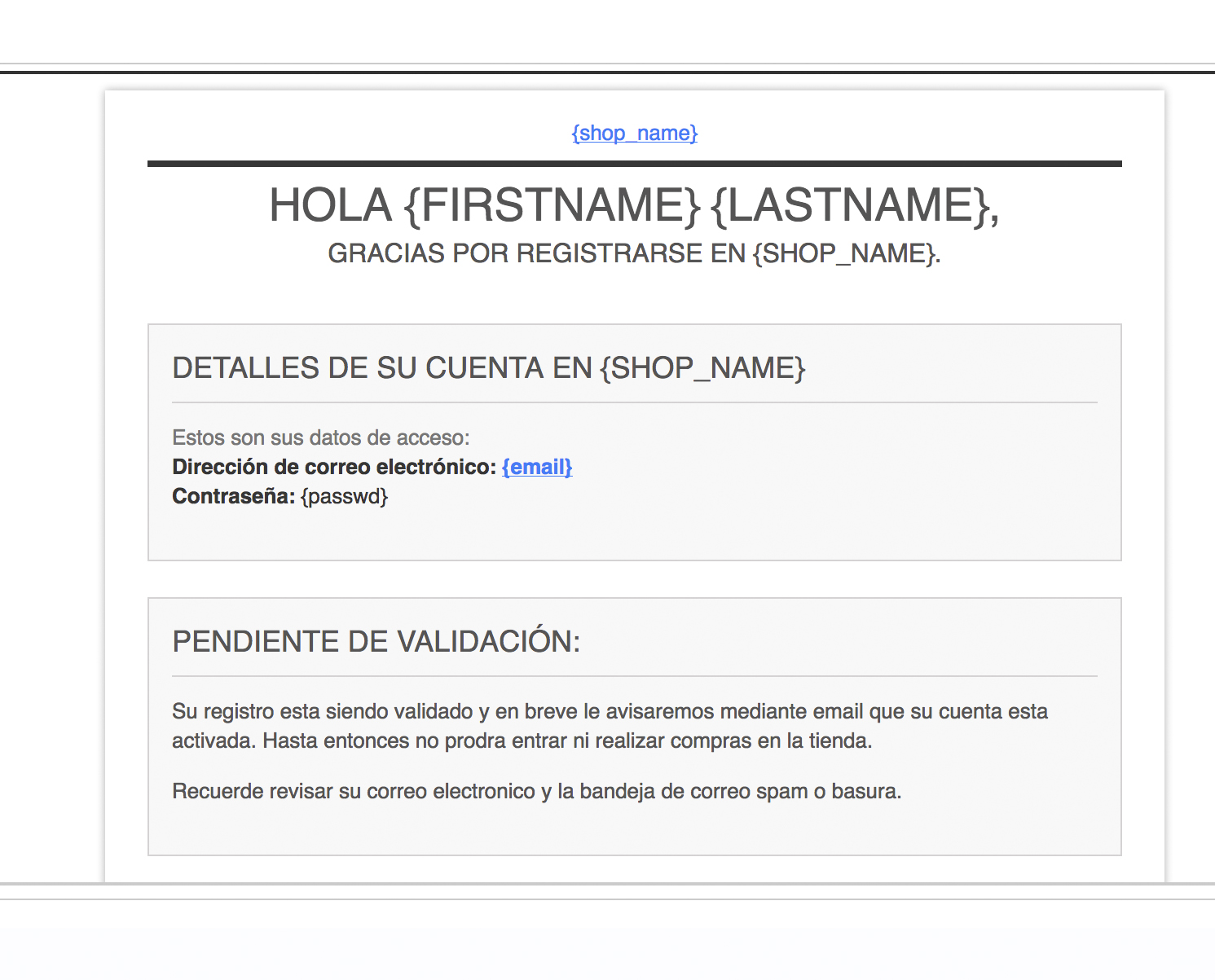 GlobalPremium Posted September 11, 2017 Share Posted September 11, 2017 Hola, a ver si alguien puede ayudarme a resolver esta duda. Tengo montada una tienda con prestashop 1.7, es privada, utilizo los modiulos de Tienda privada y registro validado de innovadeluxe. La cuestion es que quiero incluir en el mail que recibe el cliente su contraseña. Lo he editado y le he añadido esto {passwd} para que cada cliente vea la contraseña que ha puesto, pero no funciona, en el mail se ve el codigo este. Alguien sabe como hacer para que salga bien. Muchas gracias Link to comment Share on other sites More sharing options...