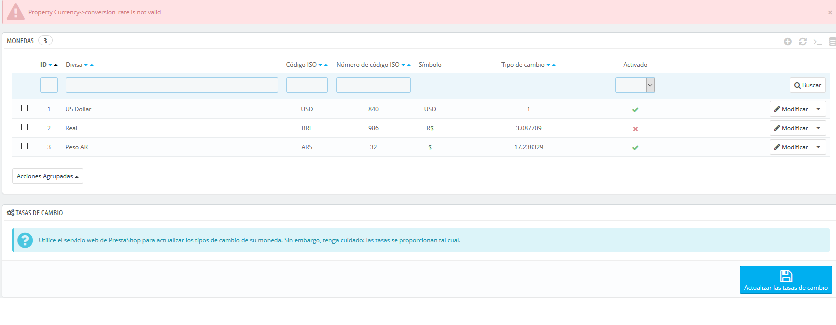 Matías Iglesias Posted September 12, 2017 Share Posted September 12, 2017 Estimados buenos días, Les consulto lo siguiente: Todos los días, de forma manual, actualizo las tasas de cambio de mi prestashop debido a que no puedo hacer funcionar las actualizaciones automáticas. Pero hoy al querer actualizar las tasas de cambio me apareció el siguiente error y no actualizó, a que se debe? El error es "property currency -> conversion_rate is not valid" Muchas gracias, dejo una captura de pantalla. Link to comment Share on other sites More sharing options...