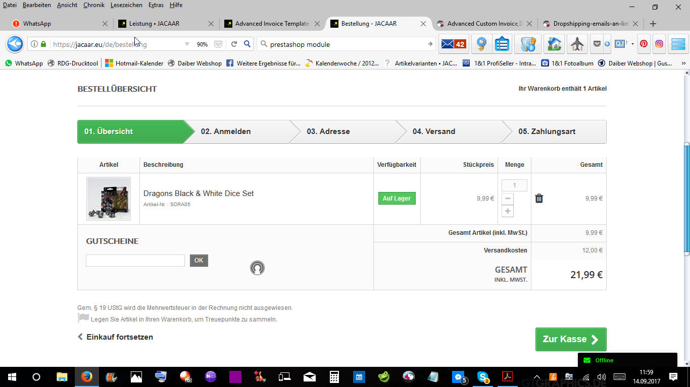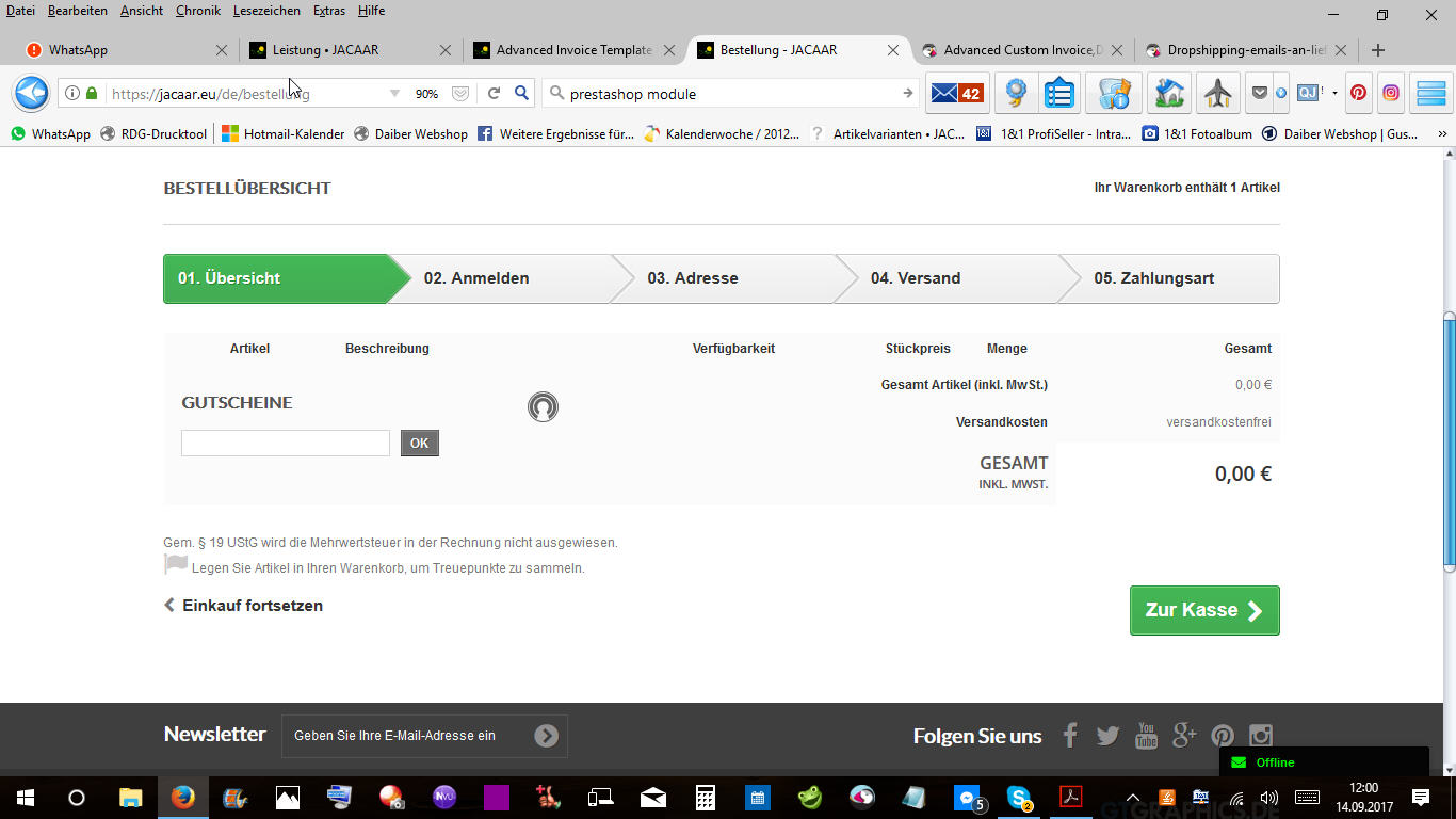 JACAAR Posted September 17, 2017 Author Share Posted September 17, 2017 Sorry, habe den Fehler gefunden, die Häckchen waren auf der falschen Mailvorlage. Habe jetzt aber noch ein Problem, weiß nicht ob ich hier weiterschreiben darf oder einen neuen Therad öffnen soll. Ich schreibe mal hier weiter: Habe mir das Modul Advanced Invoice installiert um mir das Rechnungslayout anzupassen. Soweit so gut. Bei den Eintellungen im BO musste unter Erweiterte Einstellungen/Leistung All Overrides deaktivieren auf "NEIN" gestellt werden. Poblem dabei ist, sobald ich auf "NEIN" stelle werden bei der Kaufabwicklung keine Artikel im Waenkorb angezeigt. Link to comment Share on other sites More sharing options...