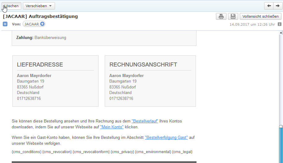 JACAAR Posted September 15, 2017 Share Posted September 15, 2017 Hallo, ich habe ein Problem mit den Anhängen AGB, Wiederrufsrecht usw. Habe im BO alles eingestellt, abr anstelle der Anhänge ist nur der Text in der Mail. Hat jemand ein Ahnung was ich falsch gemacht habe? Link to comment Share on other sites More sharing options...