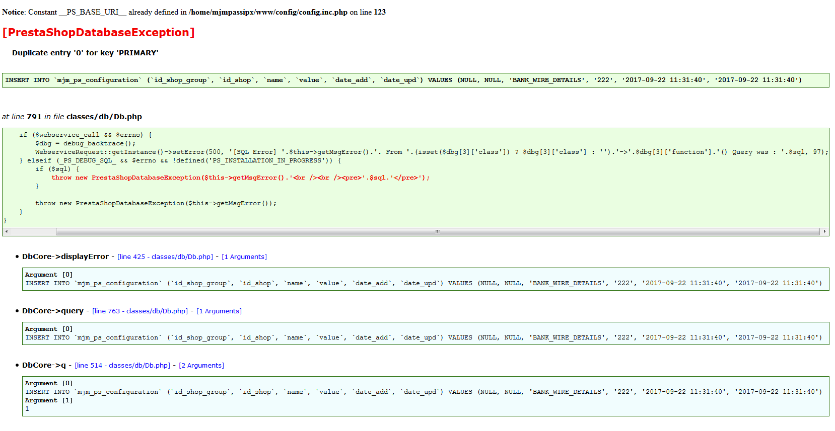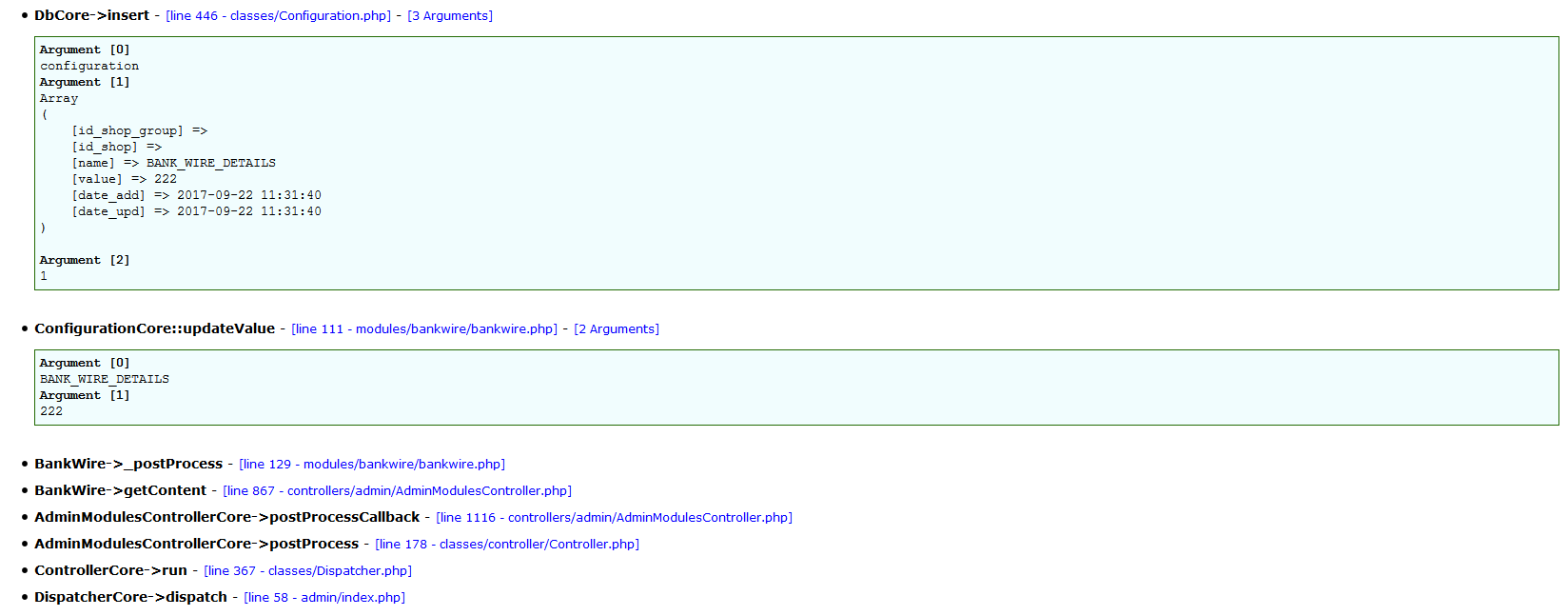 fsli Posted September 22, 2017 Author Share Posted September 22, 2017 (edited) Bonjour, Merci pour votre réponse. En activant le mode débug sur la page de config du module Virement, voici les arguments remontés : Par ailleurs, en consultant la base de données après avoir validé l'enregistrement (debug : false), je ne retrouve pas mon enregistrement dans la table mjm_ps_configuration. En effet, mon enregistrement concerne l'ajout du nom de module BANK_WIRE_DETAILS dans cette table. Or le dernier enregistrement date du 21/07/2017 et ne concerne pas ce nom de module qui n'existe pas dans la table, hormis BANK_WIRE_CURRENCIES. Comment identifier un problème lié à l'exécution de la requête, sachant que le mode debug me bloque à priori son exécution ? Merci par avance pour votre retour. Edited September 22, 2017 by fsli (see edit history) Link to comment Share on other sites More sharing options...