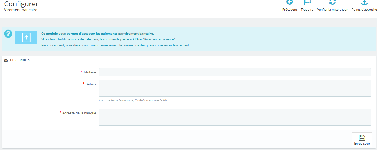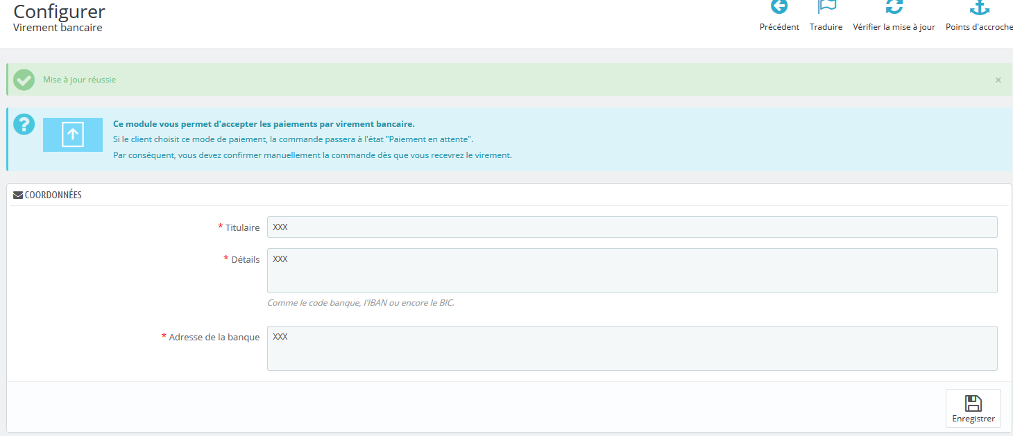 fsli Posted September 21, 2017 Share Posted September 21, 2017 (edited) Bonjour, Depuis plusieurs jours, je constate que les modules Chèque et Virement Bancaire natifs de Prestashop 1.6.1 n'enregistrent pas les données saisies dans les paramètres. En vérifiant, j'ai constaté les mêmes problèmes sur l’hébergement de test et de production. Le problème peut donc dater. Dès que je saisis des données, un message de validation apparait après enregistrement. Cependant, en revenant sur la liste des modules, je retrouve les messages d'avertissements d'origine : Il y a 2 avertissements. Chèque : Les champs "Payer à l'ordre de" et "Adresse" doivent être configurés avant d'utiliser ce module. Virement bancaire : Le titulaire du compte et les informations bancaires doivent être configurés. En cliquant sur chacun d'eux, je retourne sur le paramétrage du module, vidé de ses données qui pourtant semblaient être enregistrées au préalable. Pour autant, mes autres enregistrements marchent bien, notamment pour les produits. Je ne parviens pas à retrouver la table de la base devant contenir les données de config chèque et virement, pour contrôle. Infos techniques : Version PHP : 5.6 Version MySQL : 5.6 Serveur OVH mutualisé Comment résoudre ces problèmes d'enregistrements ? Merci par avance pour votre retour. Fred Edited September 21, 2017 by fsli (see edit history) Link to comment Share on other sites More sharing options...