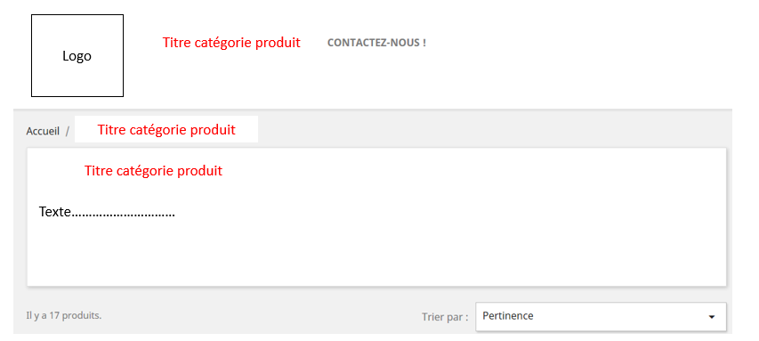 tsaut Posted September 21, 2017 Share Posted September 21, 2017 Bonjour à tous, J'ai téléchargé la version 1.7.2.1 de prestashop voilà un mois. Si je suis arrivé à paramétrer le thème par défaut (modules / apparence / catégories / etc.), je bute actuellement sur la suppression des titres des pages qui sont répétés. Je m'explique : J'ai par exemple créé une "catégorie A", que j'affiche dans le menu principal (jusqu'ici tout va bien). Lorsque l'on se rend sur la page de la catégorie A, prestashop affiche : - en titre de page Accueil / "catégorie A" - en titre du texte "Catégorie A" La répétition, c'est bien, mais un peu lourd... Ce comportement standard se reproduit également sur les pages statiques crées (rubrique "pages vues) 3 questions : Comment supprimer le titre de la page ? Comment supprimer le titre du texte ? Comment supprimer le bloc texte de la page (je ne parle pas du bloc texte personnalisé de la home page!) Je joins un screenshot pour illustration ! Merci pour votre aide et votre temps ! Link to comment Share on other sites More sharing options...