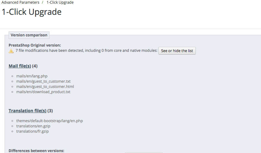 lakhan79 Posted September 27, 2017 Share Posted September 27, 2017 Hi There, I want to upgrade from 1.6.1.7 to 1.7.2.2 but getting some errors here are some errors I am facing when I try to update from this module it shows error in Version Comparision Version comparison PrestaShop Original version: 7 file modifications have been detected, including 0 from core and native modules: See or hide the list Mail file(s) (4) o mails/en/lang.php o mails/en/guest_to_customer.txt o mails/en/guest_to_customer.html o mails/en/download_product.txt Translation file(s) (3) o themes/default-bootstrap/lang/en.php o translations/en.gzip o translations/fr.gzip i changed all files from my backup but the errors still the same once these error get sorted than only i am able to upgrade it to 1.7.2.2 please help me to get rid of these errors Thanks in advance Link to comment Share on other sites More sharing options...