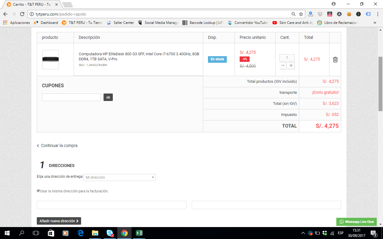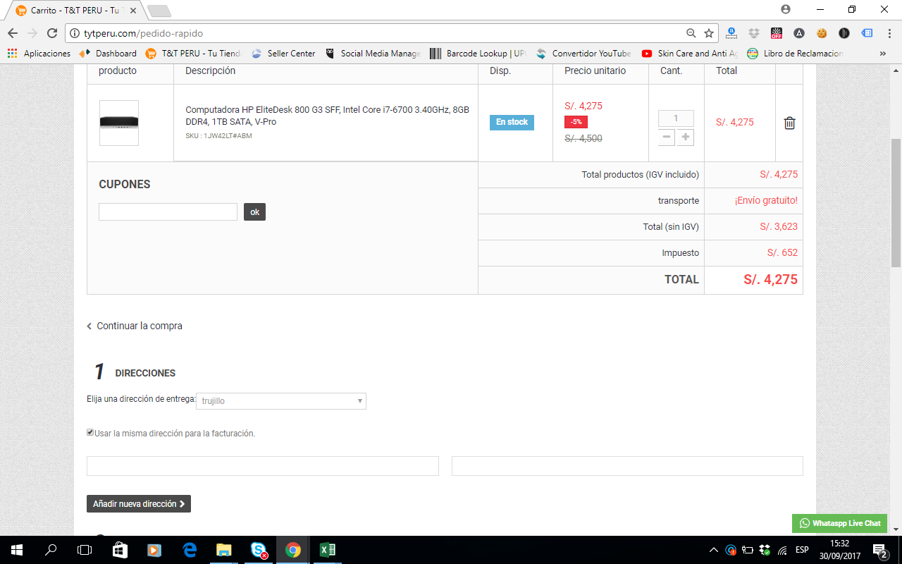 En imagen 2 pueden ver que cambio dirección a Trujillo el cual tiene distinto transportista que es un transporte con costo pero en el carro de compras no actualiza al igual que la casilla donde deben aparecer la direcciones de entrega y facturación tampoco aparecen   Captura%20de%20pantalla%202017-09-30%201