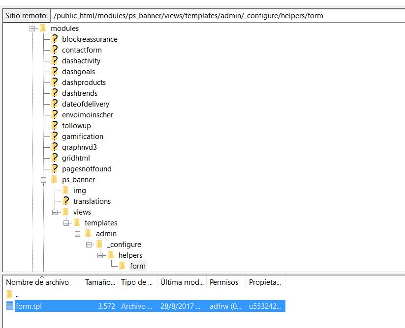 adrianpegaso Posted October 7, 2017 Author Share Posted October 7, 2017 e nal carpeta modules/ps_banner seguramente haya una carpeta views/front o hook, y ahi tienes el tpl. seguramente tendras el codigo para editar el banner y poner un target="_blank" Hola! Gracias por responder! Te comento dentro de "modules/ps_banner" se despliega un gran arbol de carpetas que no tienen nada dentro salvo la ultima que contiene el archivo "form.tpl" Del cual tiene esta informacion y no me aparece que incorpore el link que ya tengo aplicado desde el back office. Desde ya agradezco cualquier posible ayuda. {* * 2007-2015 PrestaShop * * NOTICE OF LICENSE * * This source file is subject to the Academic Free License (AFL 3.0) * that is bundled with this package in the file LICENSE.txt. * It is also available through the world-wide-web at this URL: * http://opensource.org/licenses/afl-3.0.php * If you did not receive a copy of the license and are unable to * obtain it through the world-wide-web, please send an email * to [email protected] so we can send you a copy immediately. * * DISCLAIMER * * Do not edit or add to this file if you wish to upgrade PrestaShop to newer * versions in the future. If you wish to customize PrestaShop for your * needs please refer to http://www.prestashop.com for more information. * * @author PrestaShop SA <[email protected]> * @copyright 2007-2015 PrestaShop SA * @license http://opensource.org/licenses/afl-3.0.php Academic Free License (AFL 3.0) * International Registered Trademark & Property of PrestaShop SA *} {extends file="helpers/form/form.tpl"} {block name="field"} {if $input.type == 'file_lang'} <div class="col-lg-9"> {foreach from=$languages item=language} {if $languages|count > 1} <div class="translatable-field lang-{$language.id_lang}" {if $language.id_lang != $defaultFormLanguage}style="display:none"{/if}> {/if} <div class="form-group"> <div class="col-lg-6"> <input id="{$input.name}_{$language.id_lang}" type="file" name="{$input.name}_{$language.id_lang}" class="hide" /> <div class="dummyfile input-group"> <span class="input-group-addon"><i class="icon-file"></i></span> <input id="{$input.name}_{$language.id_lang}-name" type="text" class="disabled" name="filename" readonly /> <span class="input-group-btn"> <button id="{$input.name}_{$language.id_lang}-selectbutton" type="button" name="submitAddAttachments" class="btn btn-default"> <i class="icon-folder-open"></i> {l s='Choose a file' d='Modules.Banner.Shop'} </button> </span> </div> </div> {if $languages|count > 1} <div class="col-lg-2"> <button type="button" class="btn btn-default dropdown-toggle" tabindex="-1" data-toggle="dropdown"> {$language.iso_code} <span class="caret"></span> </button> <ul class="dropdown-menu"> {foreach from=$languages item=lang} <li><a href="javascript:hideOtherLanguage({$lang.id_lang});" tabindex="-1">{$lang.name}</a></li> {/foreach} </ul> </div> {/if} </div> <div class="form-group"> {if isset($fields_value[$input.name][$language.id_lang]) && $fields_value[$input.name][$language.id_lang] != ''} <div id="{$input.name}-{$language.id_lang}-images-thumbnails" class="col-lg-12"> <img src="{$uri}img/{$fields_value[$input.name][$language.id_lang]}" class="img-thumbnail"/> </div> {/if} </div> {if $languages|count > 1} </div> {/if} <script> $(document).ready(function(){ $('#{$input.name}_{$language.id_lang}-selectbutton').click(function(e){ $('#{$input.name}_{$language.id_lang}').trigger('click'); }); $('#{$input.name}_{$language.id_lang}').change(function(e){ var val = $(this).val(); var file = val.split(/[\\/]/); $('#{$input.name}_{$language.id_lang}-name').val(file[file.length-1]); }); }); </script> {/foreach} {if isset($input.desc) && !empty($input.desc)} <p class="help-block"> {$input.desc} </p> {/if} </div> {else} {$smarty.block.parent} {/if} {/block} Link to comment Share on other sites More sharing options...