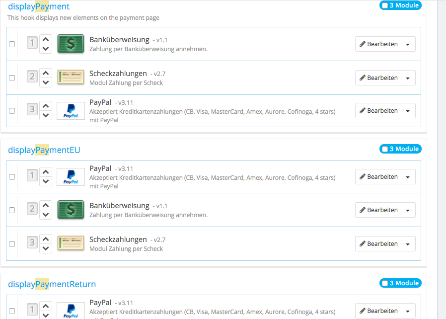 jschm Posted October 3, 2017 Share Posted October 3, 2017 (edited) Hallo zusammen, ich habe das Problem, dass in Schritt in meinem Shop bei den Zahlungsmethoden nur Überweisung angezeigt wird, paypal wird mir nicht (mehr) angezeigt. (Screen1) Ich habe viel im Forum gesucht und häufig lag es an einem fehlenden Hook, dieser ist aber wohl gesetzt (siehe Screen2). Neben PayPal habe ich auch das Modul "advancedeucompliance" aktiv, dort auch die Einstellung "Rechtssichere Bestellübersicht aktivieren". Auch wenn ich das Rechtssicherheitsmodul deaktiviere und den Cache lösche wird mir PayPal nicht angezeigt in Schritt 5. Bei den Kundengruppen "Gast" sowie "Kunde" ist PayPal ebenfalls aktiviert. API-Daten sind im PayPal Modul hinterlegt. Bin leider etwas ratlos, woran kann es denn noch liegen? Das PayPal Modul hatte bereits funktioniert, da darüber eine Bestellung einging und das Geld auch ankam. Danke für jeden Tipp! Edited October 3, 2017 by jschm (see edit history) Link to comment Share on other sites More sharing options...