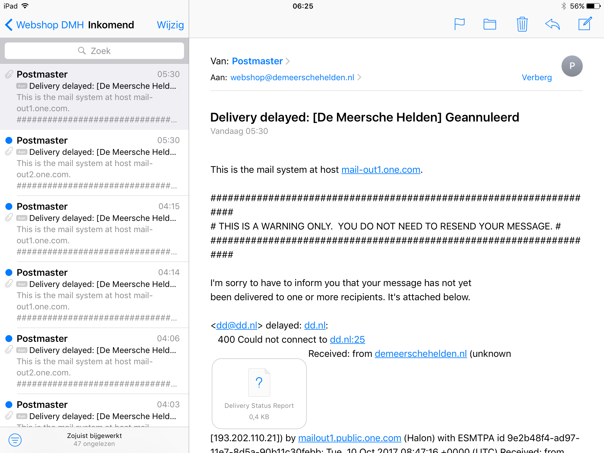 demeerschehelden Posted October 12, 2017 Share Posted October 12, 2017 nadat een klant een verkeerd/ongeldig e-Mail adres heeft ingevoerd bij gast afrekenen, krijg ik om de paar minuten een Delivery delayed mail vanuit de prestashop. dit zijn bijna 100 e-mails per dag die ik krijg van de postmaster. ik heb alle mails, klantencontacten enz al verwijderd, maar ze blijven maar terug komen. helaas is dit gebeurd nadat ik gast afrekenen ingeschakeld hebt. wie kan mij helpen om dit eindelijk stop te zetten. ? zie bijlage van de mails. pffff is niet leuk meer. Link to comment Share on other sites More sharing options...