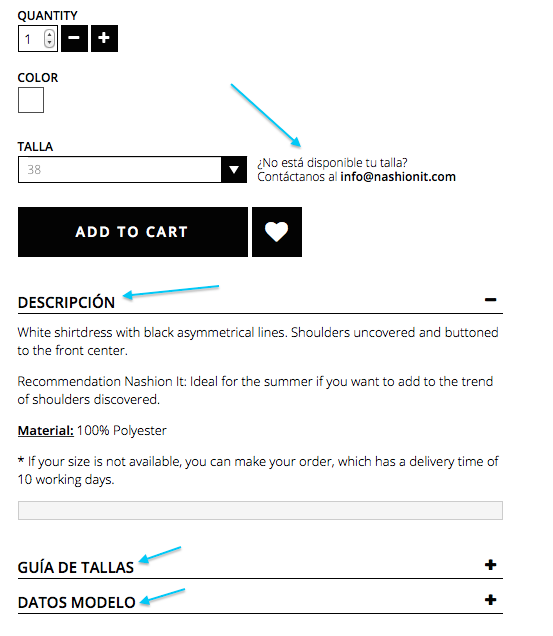 camila fuentes Posted October 15, 2017 Share Posted October 15, 2017 (edited) Hola! la verdad es que he estado buscando, pero no encontré en ningun lado la solución. en la pagina de producto, hay algunos terminos que no sé como poder traducirlos, como porejemplo las palabras: - descripción - talla de modelo - guia de tallas Alguien me podría ayudar, por favor? (adjunto imagen) Edited October 15, 2017 by camila fuentes (see edit history) Link to comment Share on other sites More sharing options...