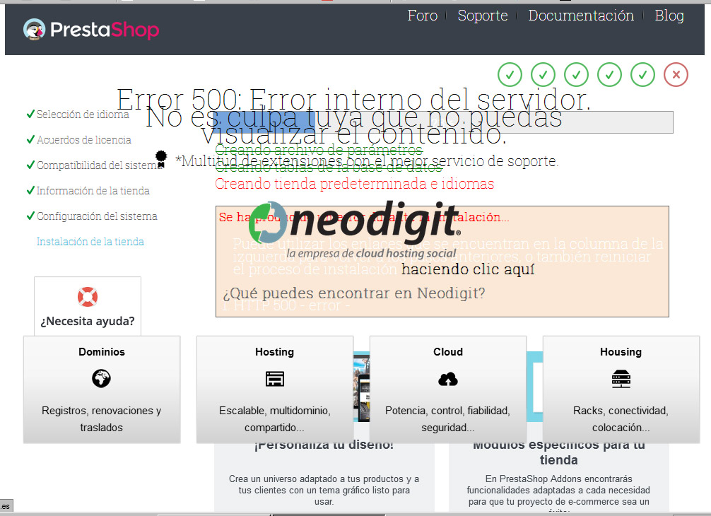 berlingt Posted October 16, 2017 Share Posted October 16, 2017 (edited) Hola, estoy intentando instalar la version 1.7.2.3 y no consigo terminarla, en el asistente de instalación despues de poner los datos de usuario y de la base de datos, cuando empieza en el proceso de "creacion de archivos de parámetros" al principìo se quedaba creando... (con un 0%) y al rato me saltaba "error 500". Tras varios intentos he conseguido que pase al 12%, luego en la creación de tablas al 23, pero al saltar a la siguiente fase de "creacion tienda predeterminada e idiomas" me vuelve a dar el error 500. He comprobado la base de datos y si me genera las tablas pero la mayoria estan vacias. No se donde o que mirar. Adjunto imagen del error. ¿podeis ayudarme? Gracias Edited October 17, 2017 by berlingt (see edit history) Link to comment Share on other sites More sharing options...