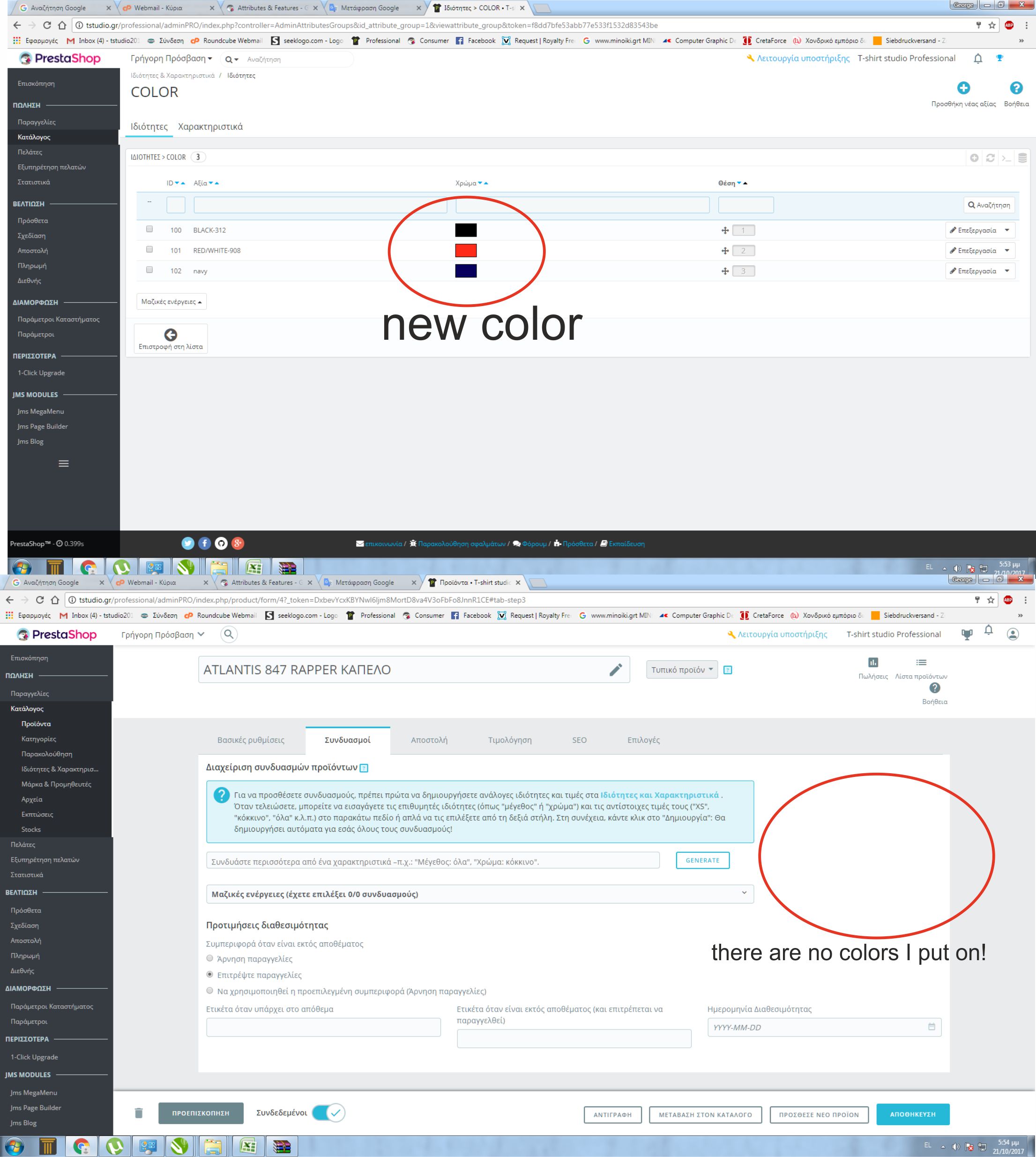 GEORGE Posted October 22, 2017 Author Share Posted October 22, 2017 Στις 20/10/2017 στις 4:19 μ.μ., ο ΓΙΩΡΓΟΣ δήλωσε: Χαρακτηριστικά & Χαρακτηριστικά: (προσθέστε νέο χρώμα σε νέο μέγεθος) αλλά όταν πηγαίνω στο προϊόν μου δεν βλέπω να το προσθέσω έκδοση PrestaShop: 1.7.2.2 Link to comment Share on other sites More sharing options...