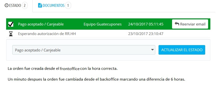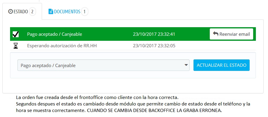 aasantosklee Posted October 25, 2017 Share Posted October 25, 2017 Estoy desesperado con este error: Cuando cambio el estado de un pedido la hora que registra el backoffice tiene 6 horas adelante (asumo una hora por defecto GMT) pero cuando hago el cambio desde el front office (con un modulo para cambiar estados) o con un modulo para hacer cambio de estados desde el teléfono o incluso cuando los mismos clientes hacen el pedido la hora es registrada ¡correctamente! me estoy volviendo loco y ahora busco ayuda de un profesional. La zona horaria esta elegida correctamente desde el backoffice. ENGLISH: I am desperate with this error: When I change the status of an order the time that registers the backoffice has 6 hours ahead (I assume an hour by default GMT) but when I make the change from the front office (with a module to change states) or with a module to change status from the phone or even when the same customers make the order the time is registered correctly! I'm going crazy and now I'm looking for help from a professional. The time zone is chosen correctly from the backoffice. Prestashop version 1.6.1.6 Link to comment Share on other sites More sharing options...