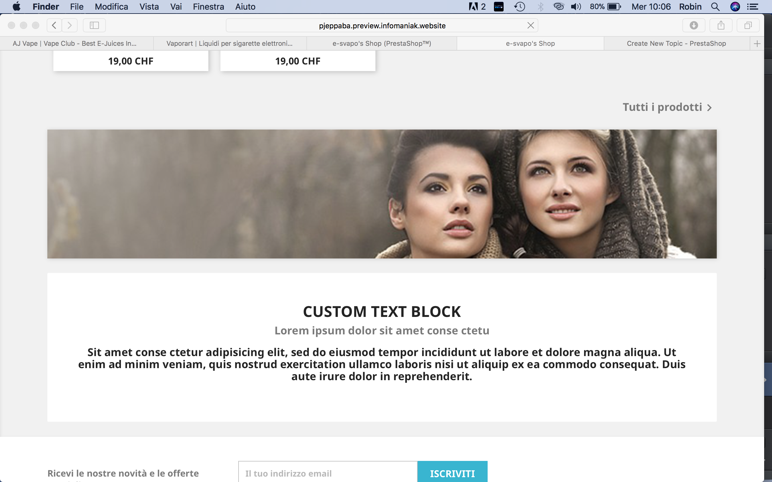 Robin_CH Posted October 25, 2017 Share Posted October 25, 2017 Buongiorno, sto creando il nuovo negozio, ma non trovo il modo di cambiare l'immagine inferiore e la scritta inferiore. H controllato in tutto back office ma non trovo nessun riferimento in questione. Link to comment Share on other sites More sharing options...