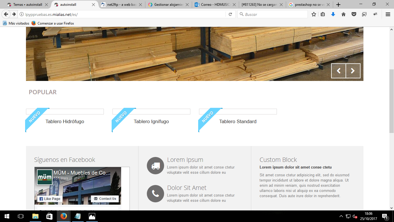 hdmusical2008 Posted October 25, 2017 Share Posted October 25, 2017 (edited) Hola, Hace unos días he empezado mi proyecto con Prestashop, y me acabo de dar cuenta que algo no va bien en relación a la imágen de los productos, en la lista o en productos destacados del Front. No aparecen. Sin embargo cuando entro en la ficha del producto sí. ¿A qué puede deberse? He probado todas las soluciones habidas y por haber que hay... Mi versión de Prestashop es 1.6.1 Adjunto captura. y link de mi página en servidor de pruebas: http://www.lpyppruebas.es.mialias.net/ USUARIO: lpyppr286 CONTRASEÑA: 5Fztvh3a Antes de todo agradecer enormemente vuestro tiempo e intención, Un saludo. Edited October 25, 2017 by hdmusical2008 (see edit history) Link to comment Share on other sites More sharing options...