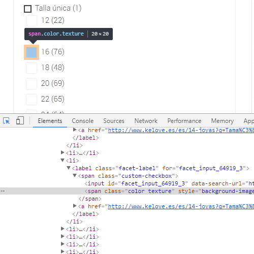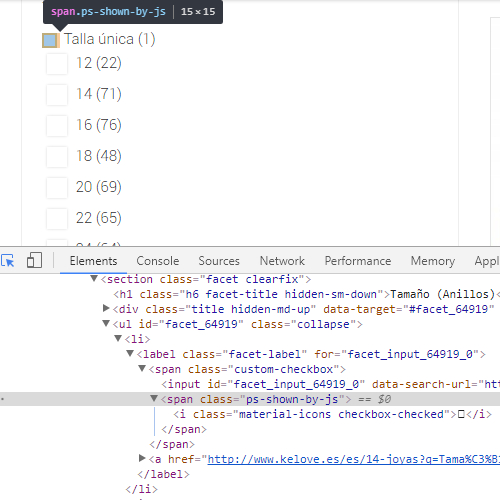 JOSSm Posted October 27, 2017 Author Share Posted October 27, 2017 (edited) Hello,Thank you very much for your answer.I know that there is the problem but I do not know what it is. {if isset ($ filter.properties.color)} <span class = "color" style = "background-color: {$ filter.properties.color}"> </ span> {elseif isset ($ filter.properties.texture)} <span class = "color texture" style = "background-image: url ({$ filter.properties.texture})"> </ span> {else} <span {if! $ js_enabled} class = "ps-shown-by-js" {/ if}> <i class = "material-icons checkbox-checked"> & # xE5CA; </ i> {/ if} </ span> Edited October 27, 2017 by JOSSm (see edit history) Link to comment Share on other sites More sharing options...