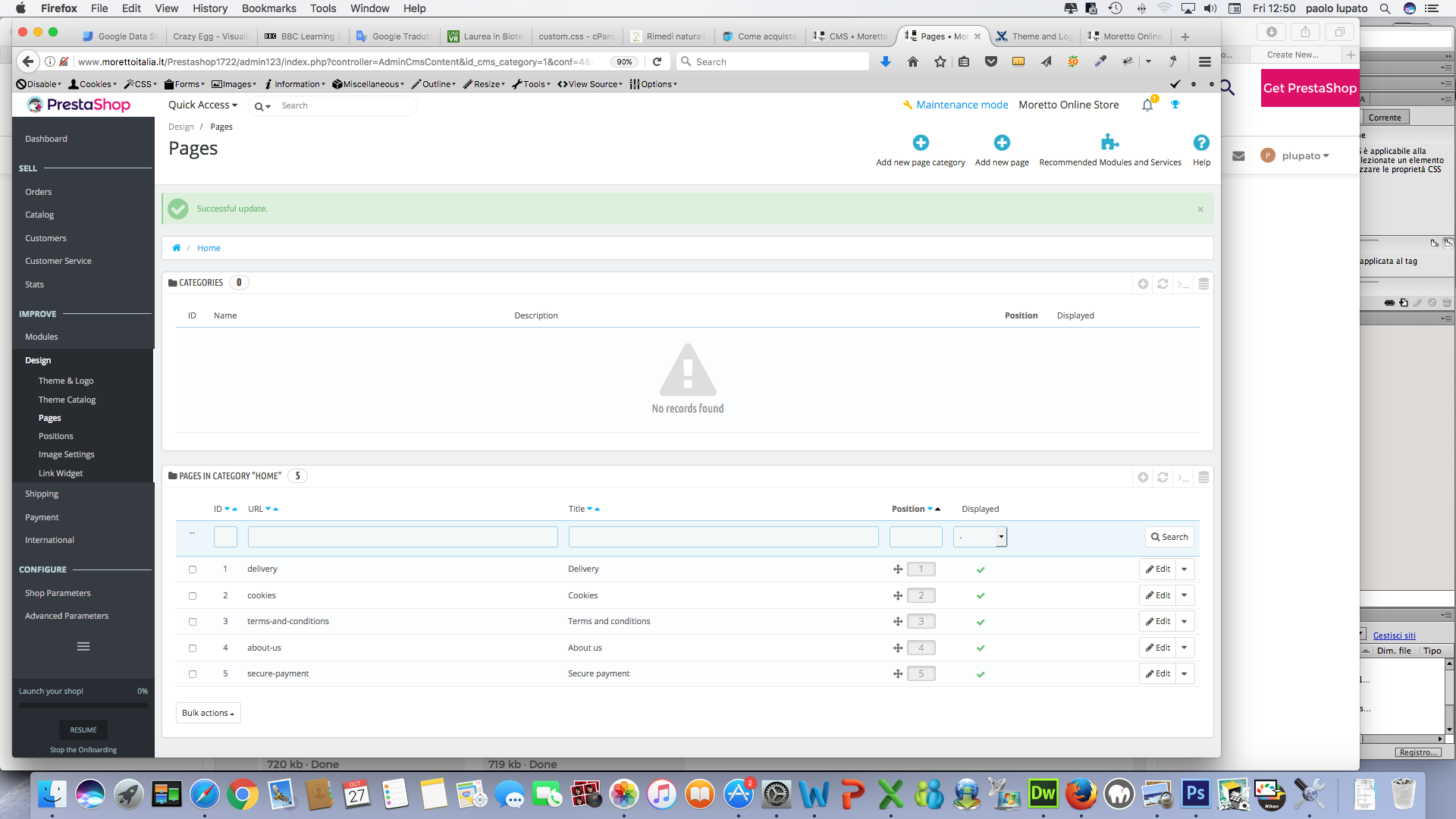 plupato Posted October 30, 2017 Author Share Posted October 30, 2017 Hello, I'd like to know how is it possibile to modify the bottom menu of the Classic theme (including Products, Our Company, Your Account, Store information) in Prestashop 1.7 - e.g. I'd like not to show the Product column. (see attachment #1) Besides, how can I manage the translation that for Italian language seems to be incorrect (see attachment #2) as I translated and partially renamed the related pages (e.g. Delivery and Legal Notice - see Attachment#3). Best regards Paolo Lupato Link to comment Share on other sites More sharing options...