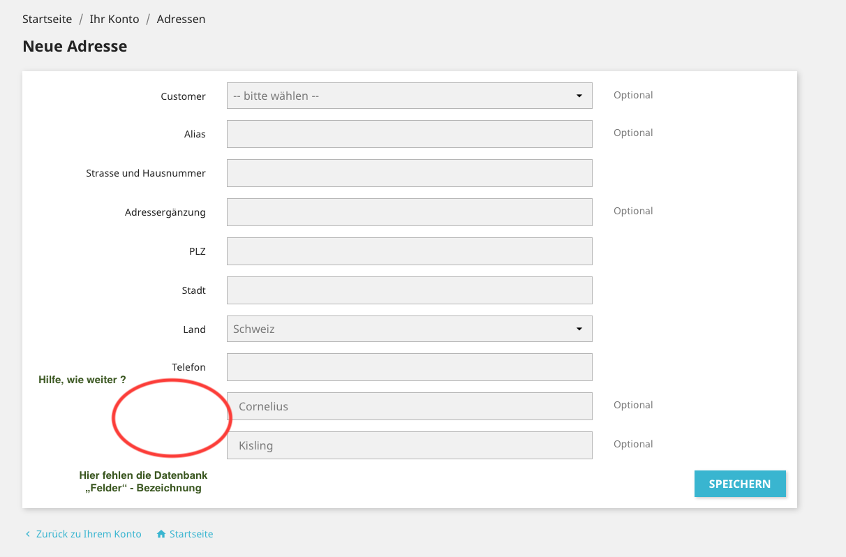 Kisling Posted October 30, 2017 Share Posted October 30, 2017 Hallo zusammen Ich weiss mir leider nicht mehr zu helfen. Beim Formular "Neue Adresse" unter Ihr Konto / Adressen, fehlen bei mir die Feldnamen für Vorname und Name gänzlich. D.h. die Felder sind überhaupt nicht beschriftet. ich habe bereits in den Übersetzungen ShopFormsLabels die Felder kontrolliert, soweit alles in Ordnung. Irgendwo muss es doch die Möglichkeit geben, das Formular anzupassen ? Wo und wie ? Wer weiss hier Bescheid ? Vielen Dank. Im Anhang ein Printscreen für mein Problem. Liebe Grüsse aus der Schweiz Link to comment Share on other sites More sharing options...