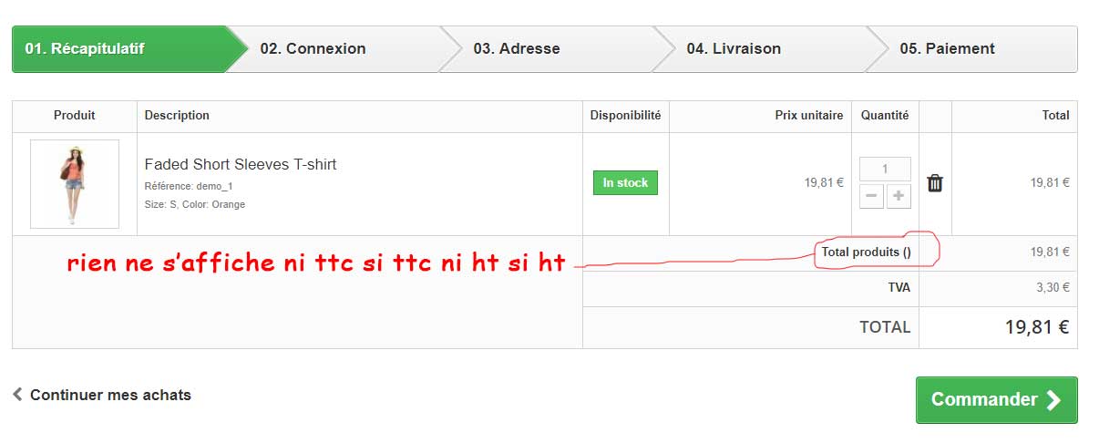 Matt K. Posted December 19, 2017 Share Posted December 19, 2017 Salut ! J'ai pu avancer sur ce problème. De mon côté il manquait une traduction dans le fichier fr.php de mon thème $_LANG['shopping-cart_db205f01b4fd580fb5daa9072d96849d'] = 'Total produits'; De plus, il faut activer le module advancedeucompliance pour qu'il puisse remplir la parenthèse avec HT ou TTC selon la configuration de ta boutique. Ce module est sympa mais il vient faire tout un tas de truc pas prévu dans mes maquettes du coup je l'ai pas activé et j'ai enlevé la parenthèse. Le code devient donc : <td colspan="{$col_span_subtotal}" class="text-right"> {l s='Total products'} (<span class="hookDisplayProductPriceBlock-price" id="HOOK_DISPLAY_PRODUCT_PRICE_BLOCK">{hook h="displayCartTotalPriceLabel"}</span>) </td> Désolé du retard ! ^^ Link to comment Share on other sites More sharing options...