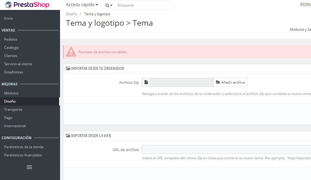 Weedmen Posted November 7, 2017 Share Posted November 7, 2017 (edited) Hola, buenos días. El mes pasado compre el siguiente Theme (template_53710 -- Responsive Flooring Store y lo abone euros 119.00) en este mismo sitio web, debería ser compatible con la versión de prestashop 1.7.1.1. porque es la versión que baje. Lo intento instalar y me arroja el siguiente error “Formato de archivo no válido.” Bajo el pedido N° Pedido #675097 el 25/10/2017 y aun, no he logrado instalarlo. Esta es la documentación que me brinda el Theme que compre, pero para mí que soy novato no es muy clara que digamos. Aquí les dejo el link. https://www.templatemonster.com/help/quick-start-guide/prestashop-themes/master/#theme_installation Lo logro descifrar cual es el archivo que debo subir. Y ahora que quiero volver a bajarlo me arroja el siguiente error. PD: Si me ayudan a solucionar el problema, publico el archivo completo para todos. Yo ya lo aboné, pero nadie me da una solución desde PRESTASHOP. Lo abone Euros 119.00. Este el theme compre: themeinstallator.rar Edited November 7, 2017 by Weedmen (see edit history) Link to comment Share on other sites More sharing options...