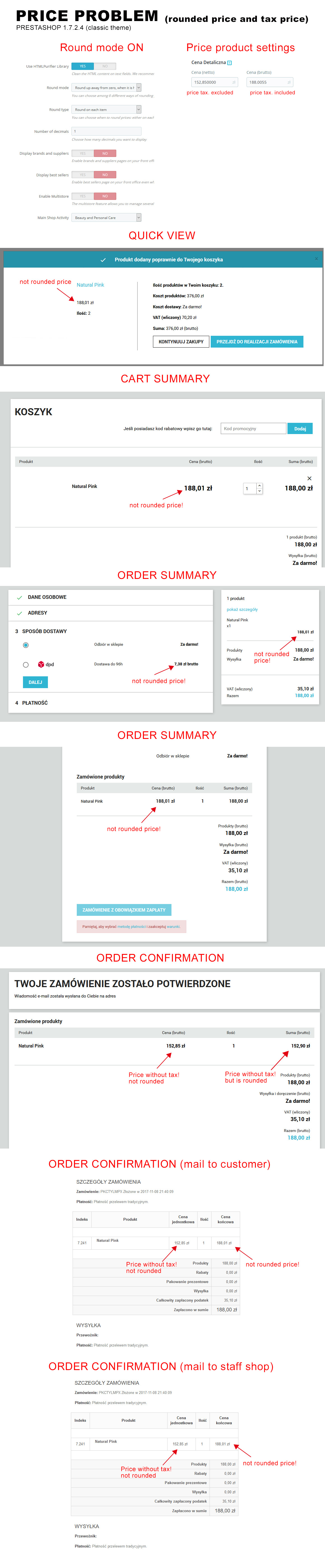 eds_dg Posted November 8, 2017 Share Posted November 8, 2017 (edited) Hey,I have a problem with rounding prices and displaying correct prices with VAT, I attach a screen where I described the exact problem, I am asking for help, I checked it on a freshly-placed store and also this is the version of prestashop 1.7.2.4 on 1.7.2.0 was the same . Regards Edited February 2, 2018 by eds_dg (see edit history) Link to comment Share on other sites More sharing options...