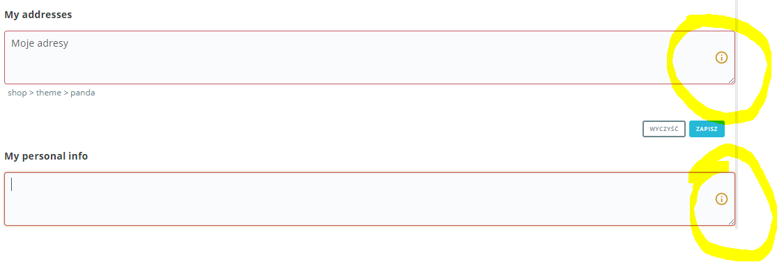 Próbuję przetłumaczyć z ang. na polski kilka elementów. Np. w stopce mam zakładkę my orders, my adress. Próbuję tłumaczyć w polu tłumaczenia szablonu. Jednak po zapisaniu tekstu, nic się nie zmienia. Wyświetla się natomiast charakterystyczne 'i' z prawej strony. Jak rozwiązać problem?