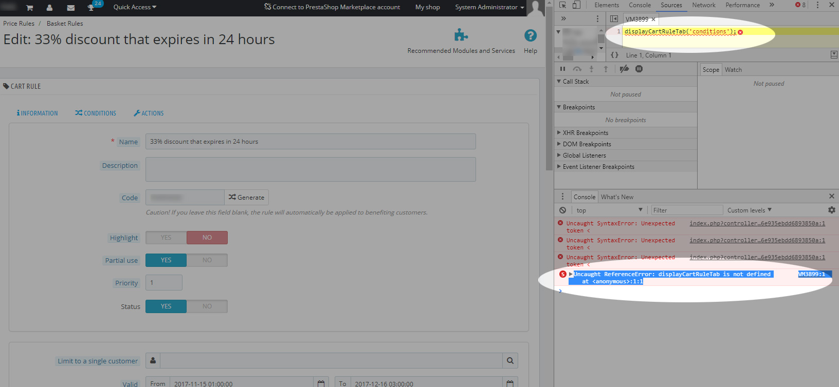 EverythingsOverpriced Posted November 15, 2017 Share Posted November 15, 2017 (edited) Hi all, When I try to create a new voucher, I notice that there are now a few problems on the page. Tabs do not work and all tabs are shown on one page (see attached screenshot). Unable to select a customer. Date calendar popups do not work. Unable to add/remove Restrictions. We are using PS 1.6x with Jakiro theme from Themeforest. Apart from the Jakiro Modules that are installed, we have also installed Paypal and Amazon payment modules. All of this was working perfectly when we tested it after a fresh PS install + theme install + paypal install. I hope someone can help. Thanks all Edited November 15, 2017 by EverythingsOverpriced (see edit history) Link to comment Share on other sites More sharing options...