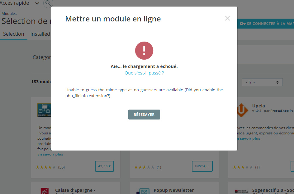 Doris972 Posted November 16, 2017 Share Posted November 16, 2017 Bonjour, Version de PrestaShop : 1.7.0.4 Quand j'essaie d'installer un module, je reçois un message d'erreur disant: Aïe... le chargement a échoué. Que s'est-il passé ? Unable to guess the mime type as no guessers are available (Did you enable the php_fileinfo extension?) Pouvez vous me donner un conseil? Cordialement, Link to comment Share on other sites More sharing options...