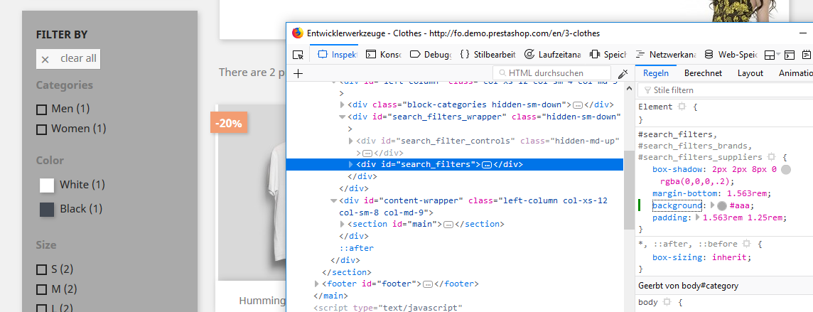 MakeOn Posted November 7, 2018 Share Posted November 7, 2018 En 17/11/2017 a las 2:05 PM, NemoPS dijo: [...] The overall box doesn't have a background set, so you can just add #search_filters_wrapper {background: #ccc} (or whatever color) to theme.css Hello I was looking how to change background color of the search filter bock but what you say is not working I'm trying with the chrome inspecting utility in demo prestashop: http://fo.demo.prestashop.com/en/3-clothes Any clue? Best regards Link to comment Share on other sites More sharing options...