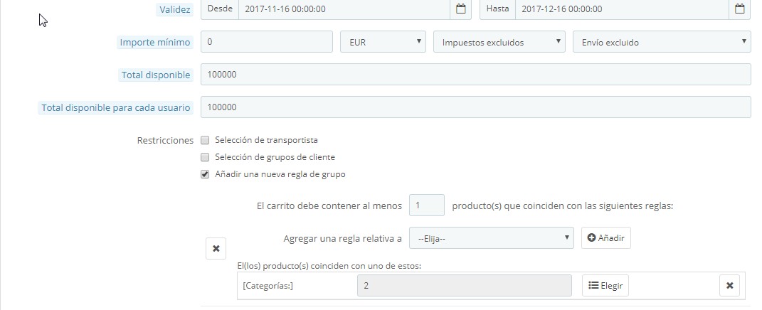 Juan Posted November 17, 2017 Share Posted November 17, 2017 Hola, Intento configurar un cupón de descuento de un 15% para productos de una determinada categoría. Me funciona sólo cuando cuando todos los productos del carrito son de esa categoría, pero en el momento que añado un producto más al carrito de otra categoría, no me permite añadir el cupón. Yo quisiera que se pudiera hacer una compra de productos de varias categorías y se aplicara el cupón sólo a los que pertenecieran a la categoría que yo he indicado. Seguro que es un error de novato, alguien me puede ayudar. Adjunto captura de condición y acciones. Gracias, Link to comment Share on other sites More sharing options...