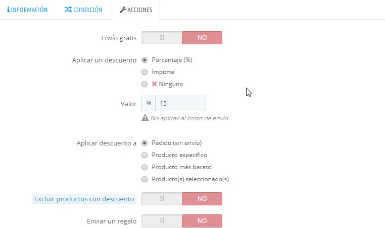 joseantgv Posted November 17, 2017 Share Posted November 17, 2017 Hola! El descuento que quieres hacer no lo permite PS. El descuento se aplicará a todos los productos. Necesitarías un módulo. Jose. Link to comment Share on other sites More sharing options...