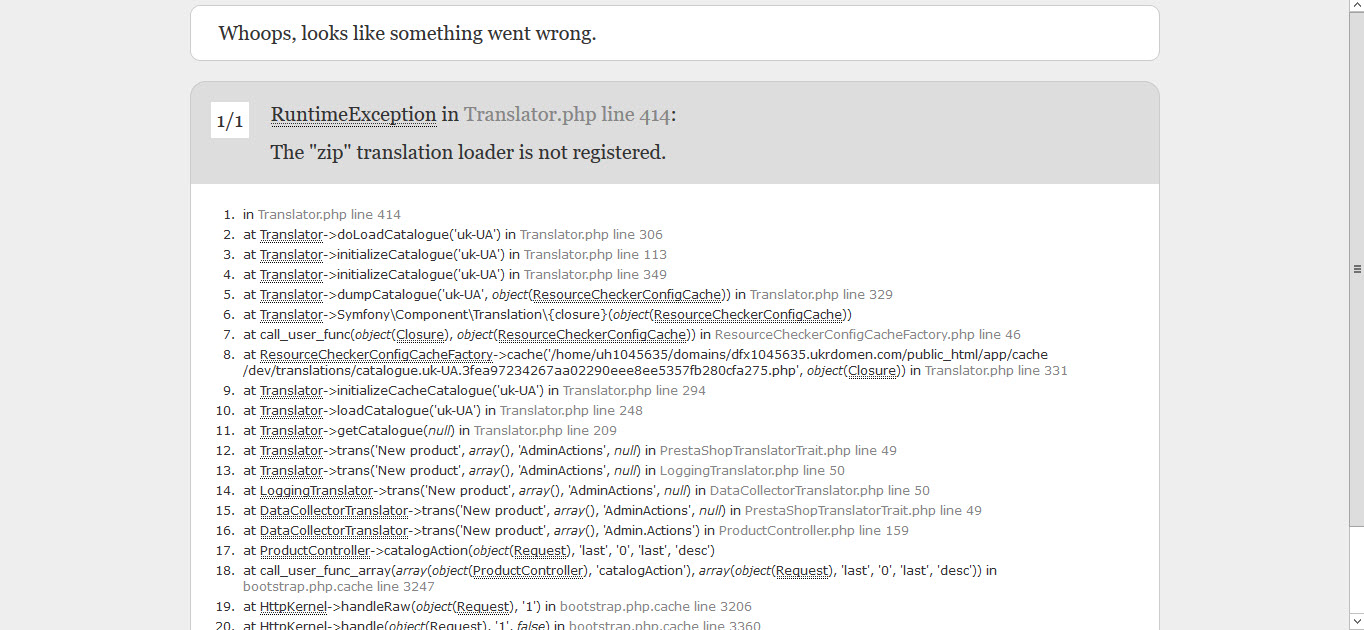 radislav72 Posted November 19, 2017 Share Posted November 19, 2017 (edited) Hi! I have local site on Prestashop 1.7.2. Locally it works fine. But when I put it to server then I have some issues: frontend works fine, but in backend when I try to enter in Products page (also Modules page) I receive a blank page. In debug mode I receive this error message: RuntimeException in Translator.php line 414: The "zip" translation loader is not registered. I try to clear cache, increasing php memory_limit to 512M and other methods that found in internet. What is the reason of this error? Edited November 19, 2017 by radislav72 (see edit history) Link to comment Share on other sites More sharing options...