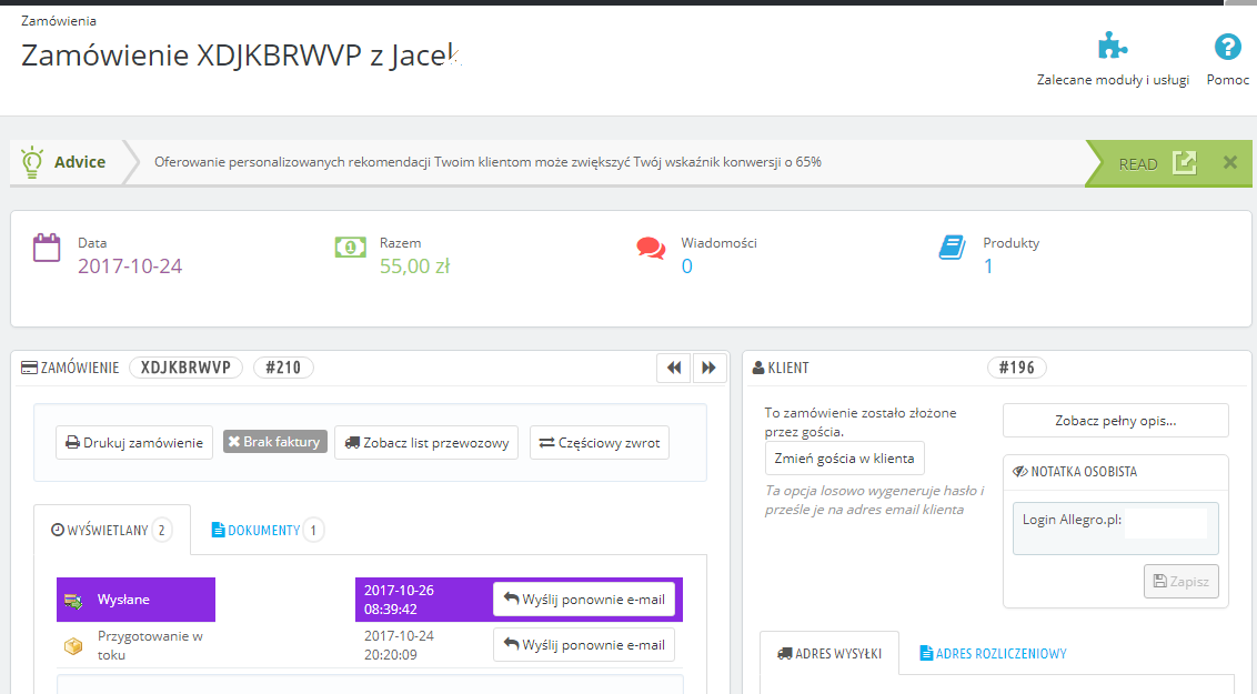 Witam, mam problem, konkretnie kiedy wejdę w panel administracyjny > zamówienia, ukazuje mi się lista zamówień zsynchronizowana z modułem Allegro.