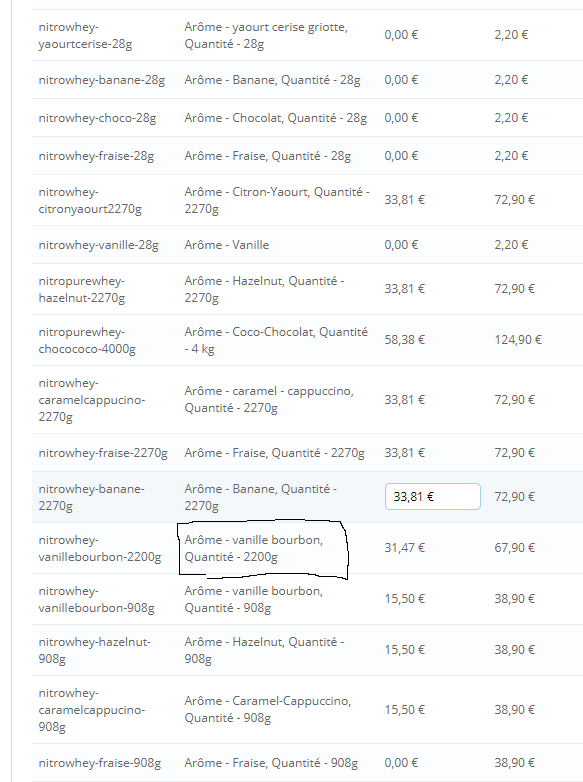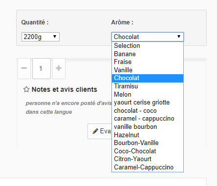 CelluleDev Posted November 23, 2017 Author Share Posted November 23, 2017 Merci pour votre reponse, mais en fait sur cette declinaison en 2200 gr il y' a qu'un gout de configuré sur la fiche produit, regardez le screen shoot ci-joint, en attendant votre retour Link to comment Share on other sites More sharing options...