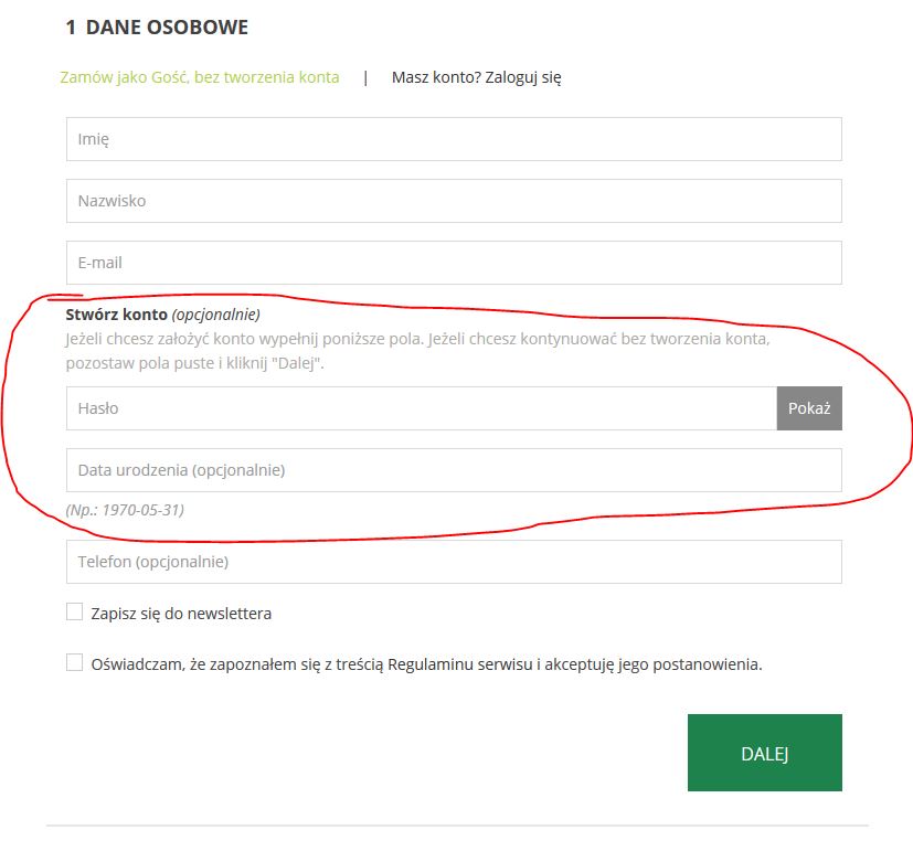 Usunięcie opcji "Stwórz konto" podczas kupna