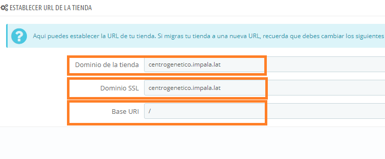 Dominio de la tienda -> Aquí en tu caso como quieres acceder a la tienda desde "centrogenetico.impala.lat" tienes que colocar: