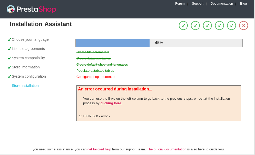 Hola... soy nuevo en el foro y con el Prestashop. Necesito ayuda de alguien porque al instalar no tengo problemas pero cuando está terminando de crear las tablas en la Base de datos me pone ERROR 500, y no se que es.