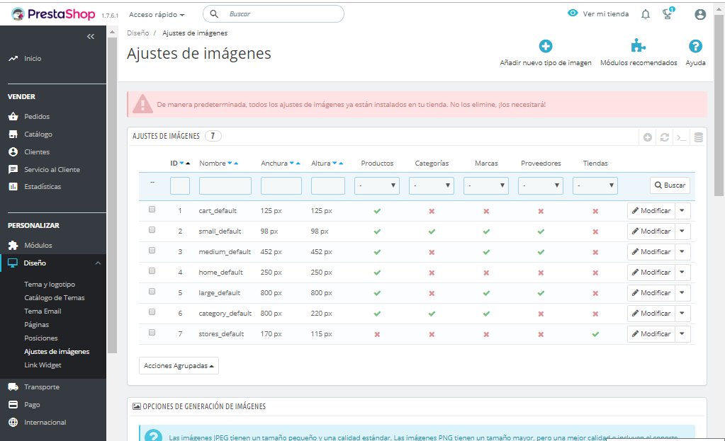 Adjunto Captura de la pestaña Diseño -> Ajustes de las imagenes del panel de administración