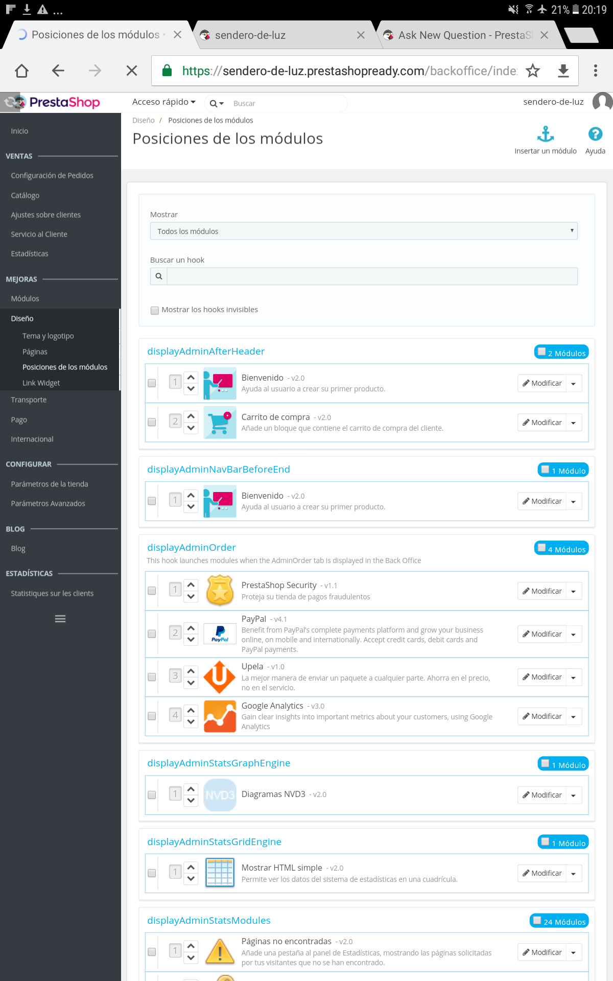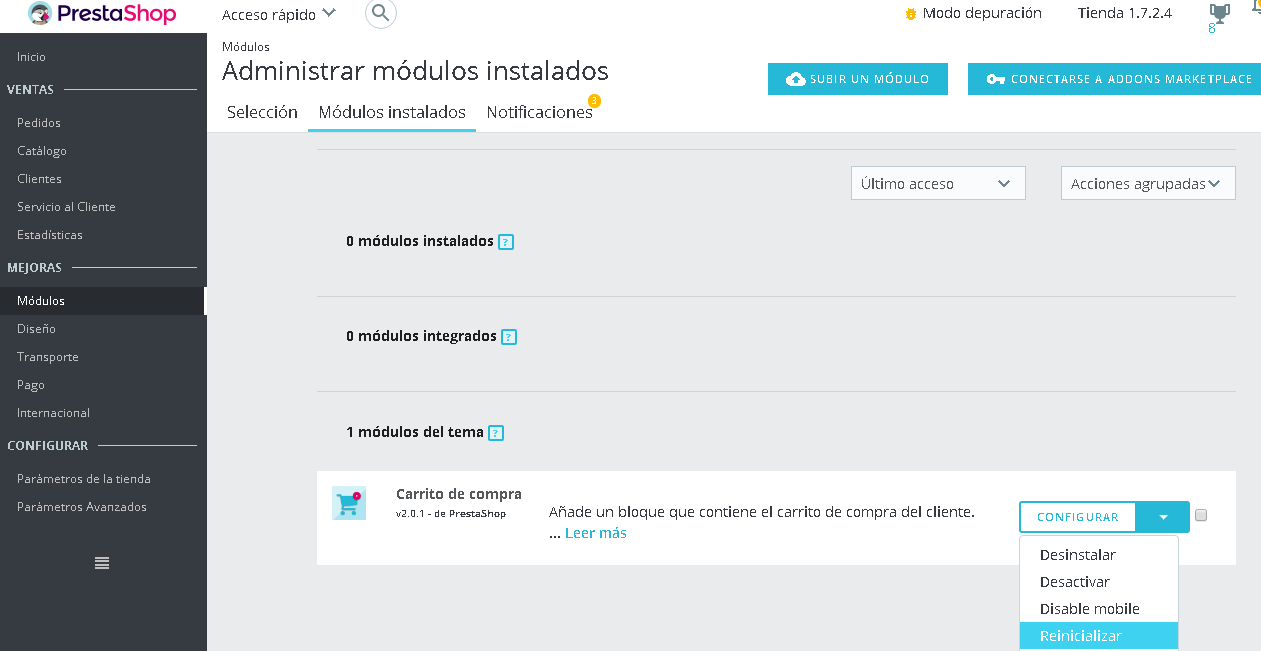 nadie Posted November 30, 2017 Share Posted November 30, 2017 ¿Te ha desaparecido de desaparecido o has activado accidentalmente el modo catalogo en la pestaña Parametros de la tienda -> Configuración de Productos -> Modo Catalogo? Si es solamente el bloque carrito de la cabecera, ve a la pestaña módulos -> módulos y servicios y buscas el módulo (Carrito de compra/ps_shoppingcart) si esta instalado reinicialo, sino esta instalado, pues lo instalas De todos modos, yo no estoy seguro que ese sea el problema, porque me he metido a la tienda que muestras en la captura, y veo que no aparece el boton de añadir al carrito por ejemplo en la ficha del producto , entonces posiblemente sea que has habilitado accidentalmente el modo catalogo, para desactivar el modo catalogo lo puedes hacer en la pestaña Parametros de la tienda -> Configuración de Productos -> Modo Catalogo -> NO Adjunto Captura Link to comment Share on other sites More sharing options...