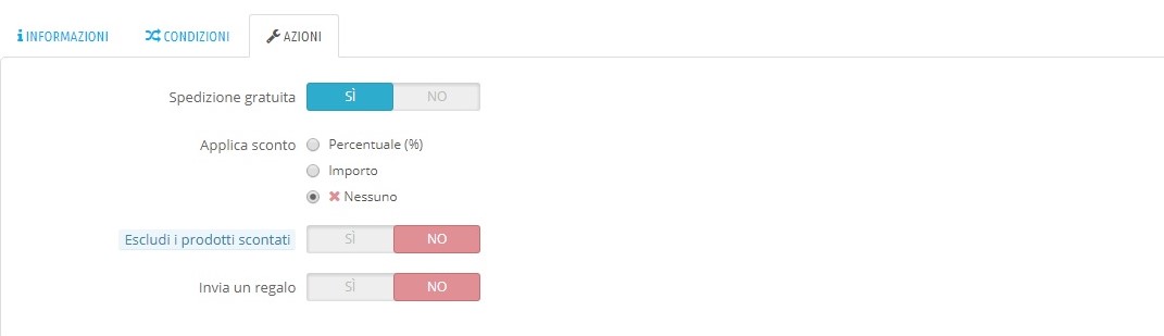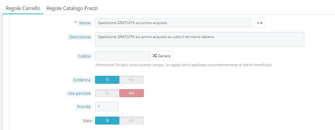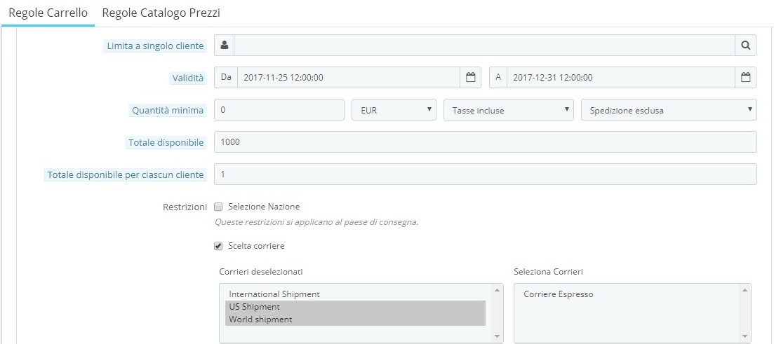Dav. Posted December 1, 2017 Share Posted December 1, 2017 Buonasera a tutti, ho da poco attivato il mio sito realizzato con Prestashop. Sto mandando avanti una campagna pubblicitaria in Italia e una in Germania. Nella campagna Italiana sto pubblicizzando la prima spedizione gratuita. Mentre in Germania sto attuando un altra promozione che non c'entra nulla con la spedizione. Volevo domandarvi cosa sto sbagliando nelle impostazioni dei codici sconto poichè non riesco a tarare le regole del carrello in maniera tale che in Italia selezionando come spedizione il corriere espresso ( unico metodo di spedizione in italia) il coupon azzeri la spesa di spedizione... mentre in germania tale coupon non vada ad influire sulle spese di spedizione in alcun modo. Grazie per l'attenzione! Link to comment Share on other sites More sharing options...